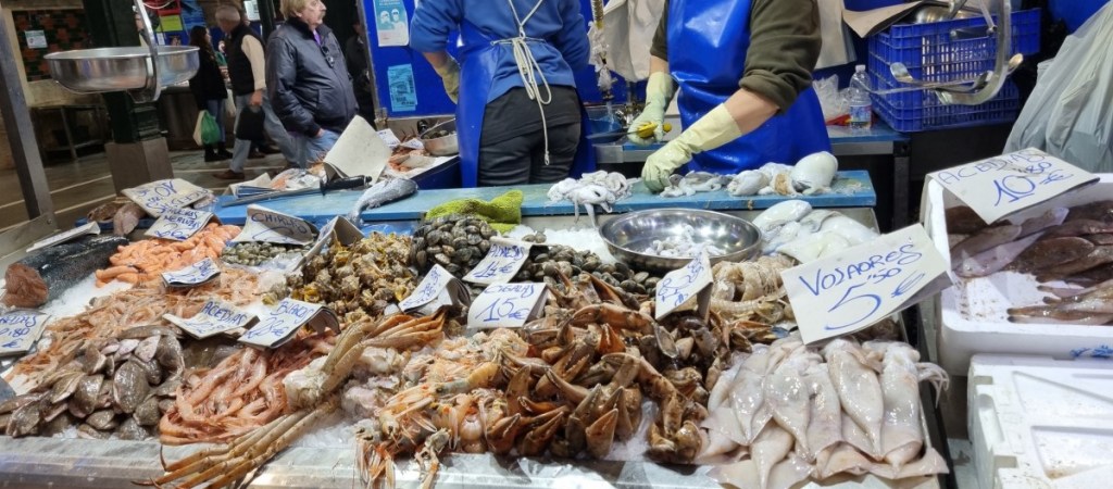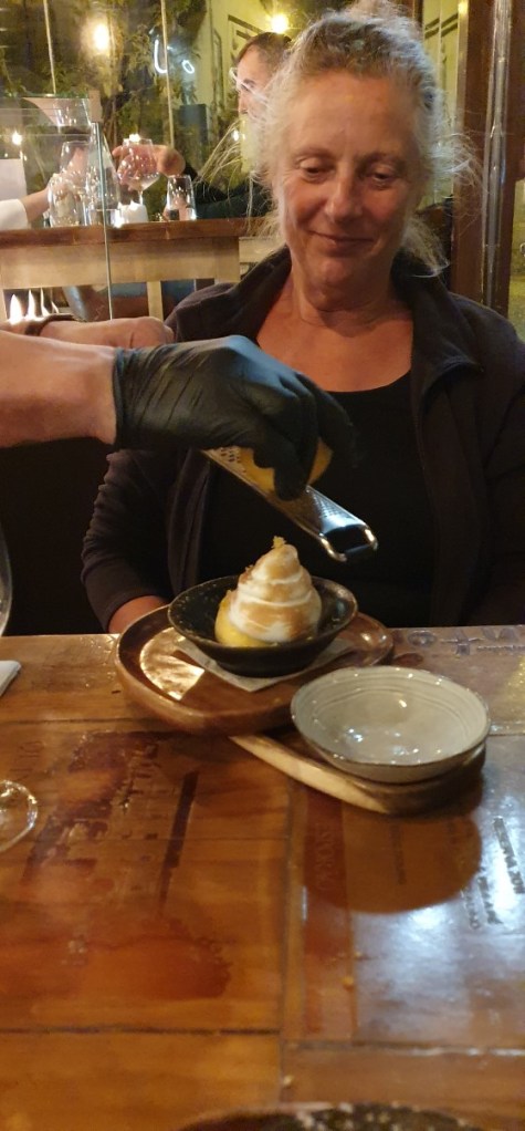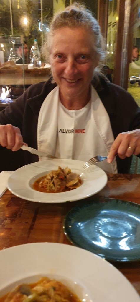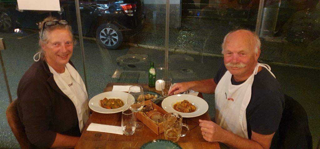 In het dorp kun je ook zalig uit eten. Hier een echte Portugese Cataplana met vlees en vis…. inclusief slabbetje…. en een lekker toetje…..