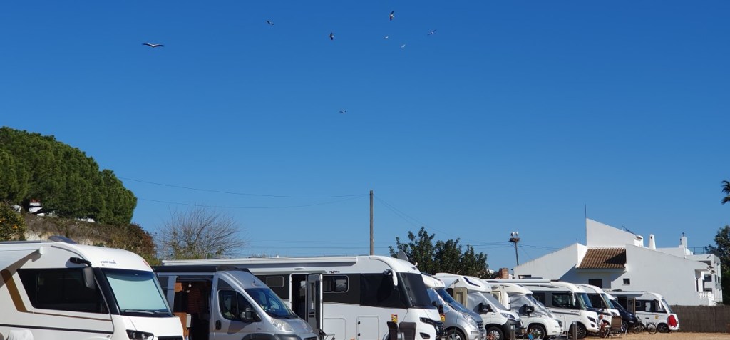 Eindelijk, 31 januari alles weer ingepakt, afscheid genomen van de buren, Hannes in zijn tuigje en wij in de gordels….. rijden maar. Niet ver vandaag. We gaan kijken in Silves, zo’n 30 km verderop het binnenland in. Laatste keer dat we hier waren was op een zondag en toen was alles dicht. Wanneer we rond 12 uur het stadje binnenrijden is het druk. De eerste camperplaats is vol, de tweede ook maar heeft nog net een plekje naast de ingang zonder stroom. Dat maakt ons niet uit, we staan. Vol in de zon en prachtig uitzicht over de velden met tientallen ooievaars. Zoveel hadden we er nog nooit bij elkaar gezien.