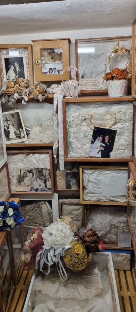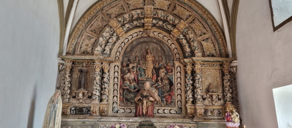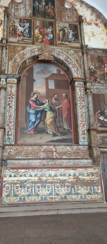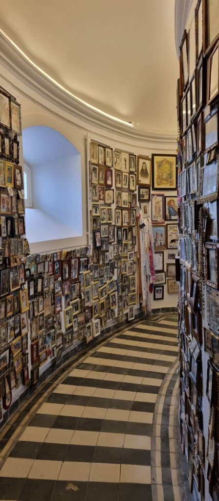 Na een lange wandeling met Hannes langs het meer vertrekken we naar Viana do Alentjo. De bedevaartkerk stond 5 jaar geleden in de steigers en nu gaan we kijken hoe het geworden is. Een echte barok kerk met tierlantijntjes. Niet echt mooi, maar wel heel bijzonder zijn de fotogalerijen en eigendommen (waaronder veel trouwjurken) van bedevaartgangers.