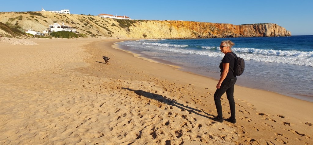 Vrijdag 3 februari rijden we verder naar Sagres. Je ziet het landschap onderweg veranderen naar een kale en door weer en wind geteisterde wereld. In Sagres zoeken we de camping op. Strand ligt op 2,5 kilometer en is verboden voor honden! Toch even balletje gegooid met Hannes.
