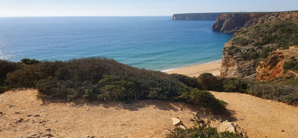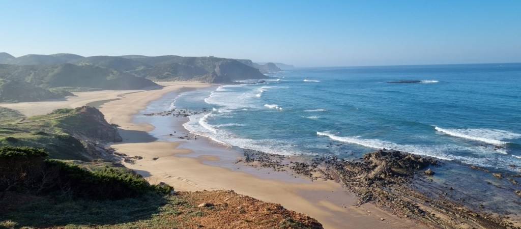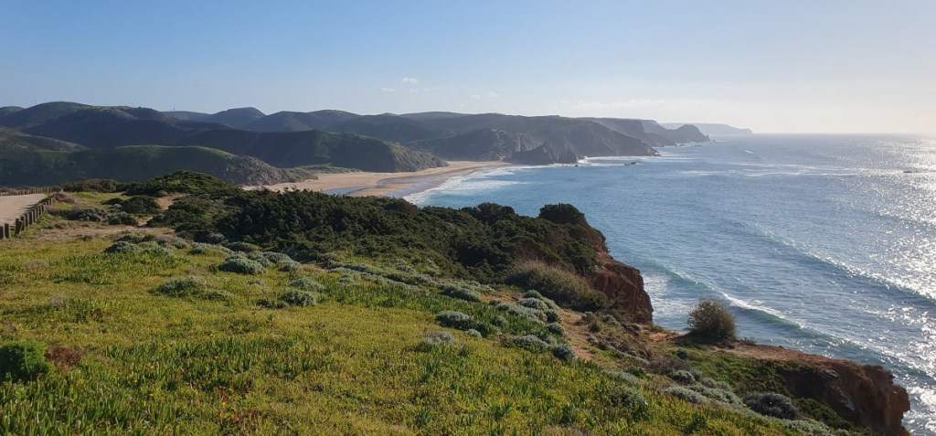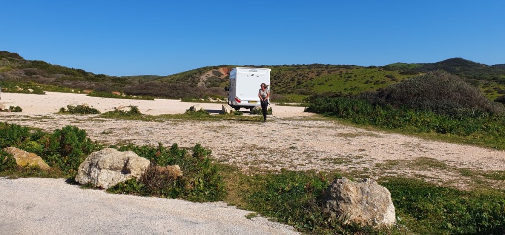 Dus maar terug en via de officiële weg naar Praia do Amado. We gaan staan op een mooi plekje met uitzicht over het strand. Mag eigenlijk niet, maar er staan al meer dus we gokken het erop. Dit is één van mijn favoriete plekjes in Portugal. Zo mooi…..