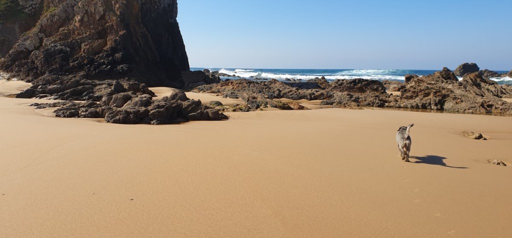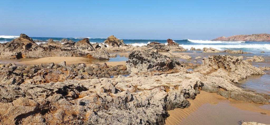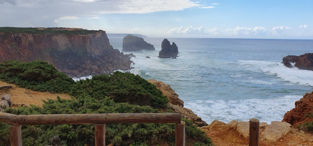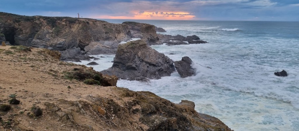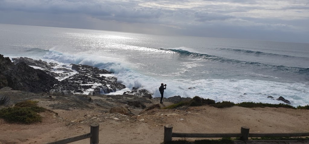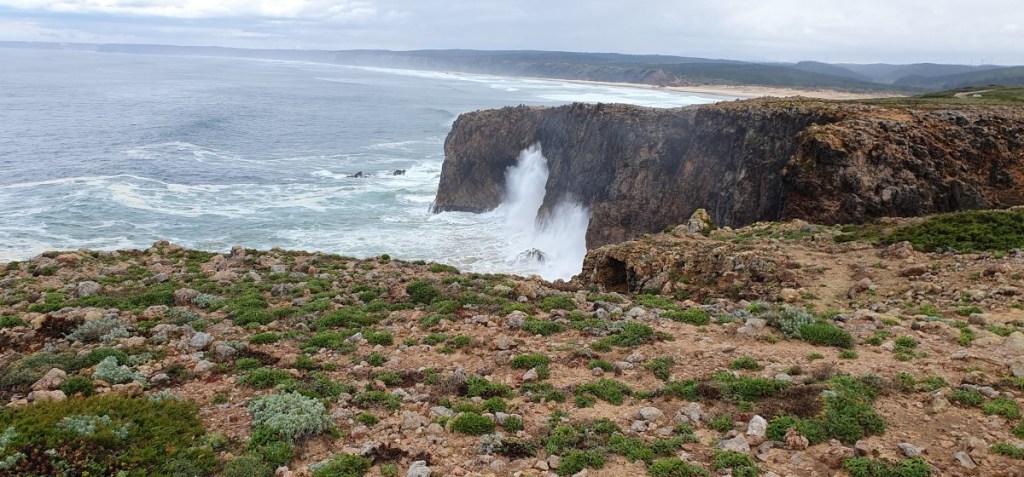 We rijden door naar nog een favoriet van ons, Porto Covo. Het voetbalveld waar we eens stonden is weer in gebruik als voetbalveld en we komen terecht op de camping, 1 kilometer van zee. We mogen een plekje uitzoeken, maar als we ons registreren horen we dat we daar niet mogen staan …. In de inmiddels stromende regen zoeken we een ander plekje….. Droge kleren aan en op naar het strand. Prachtige zee met woeste golven tegen de rotskust. De volgende dag opnieuw een mooie wandeling langs de kust.