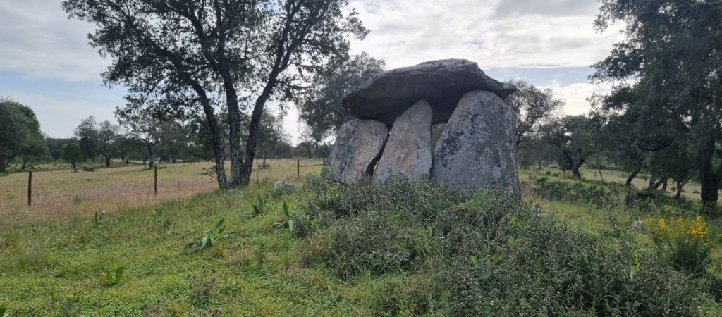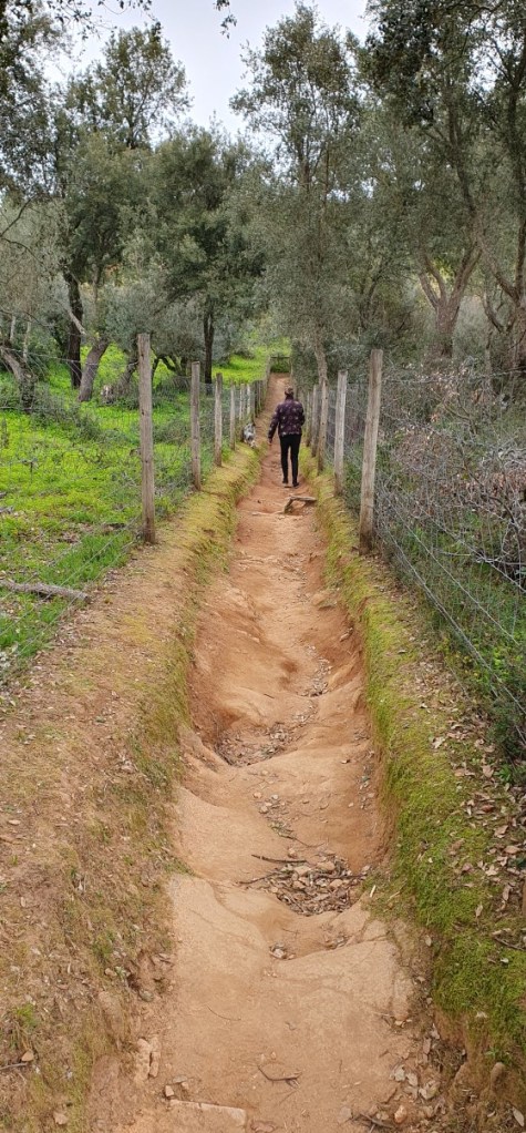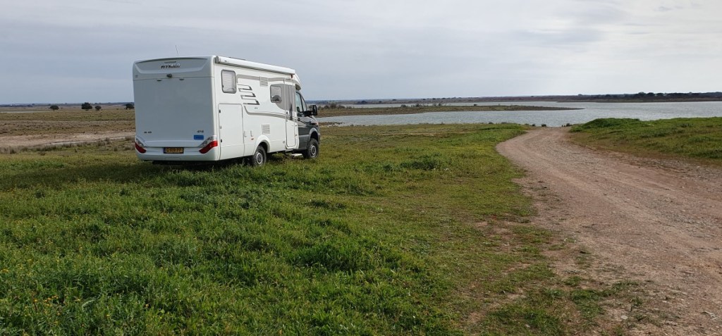 We lopen weer even rond en vervolgen onze route op de N2 door de olijvenvelden en kurkeiken. We stoppen op een camperplek aan Barragem do Roxo.