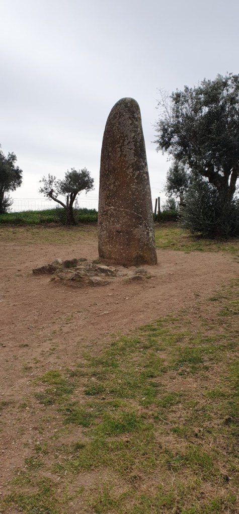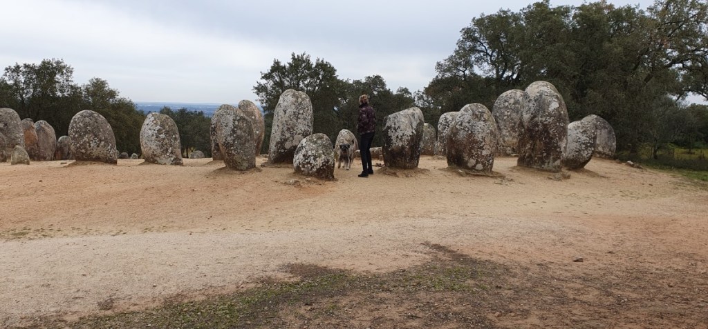 Verder over de N2 naar de Cromeleque dos Almendres. Een soort Stonehenge met een cirkel van grote staande stenen. Via een slechte dirt road en een alleenstaande menhir komen we bij de grote cirkel uit. Indrukwekkend!