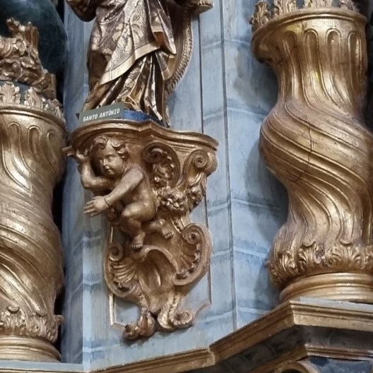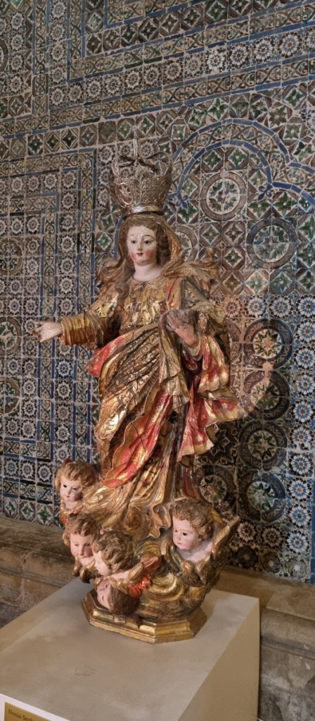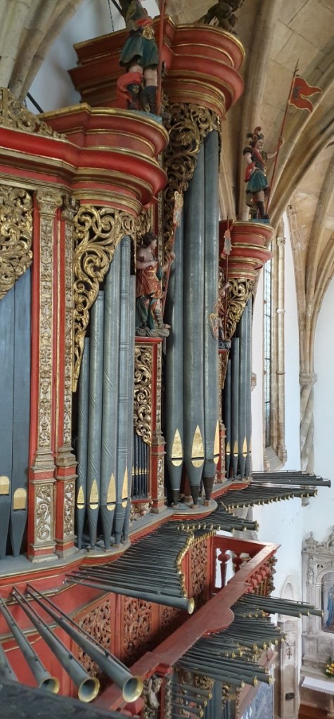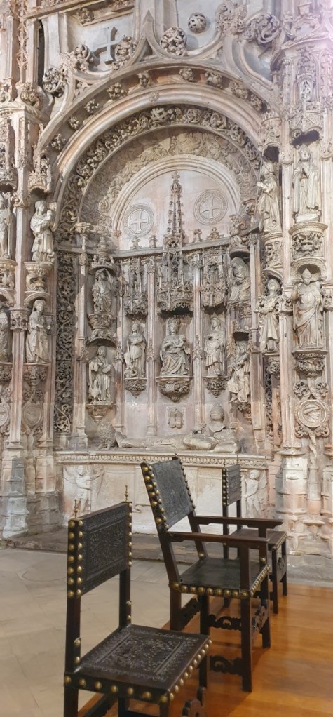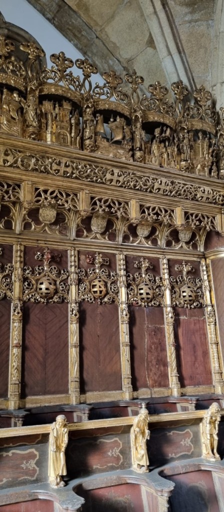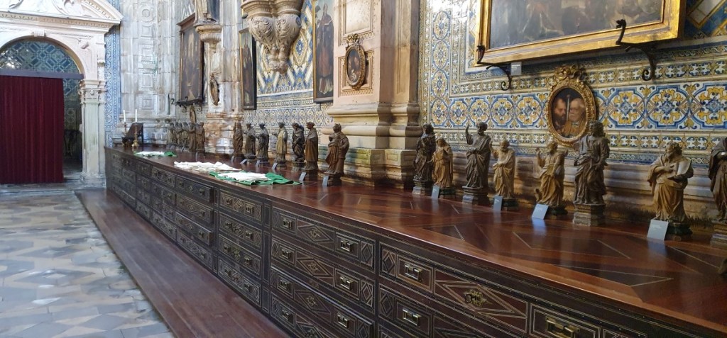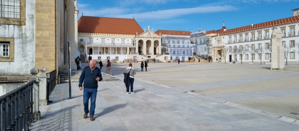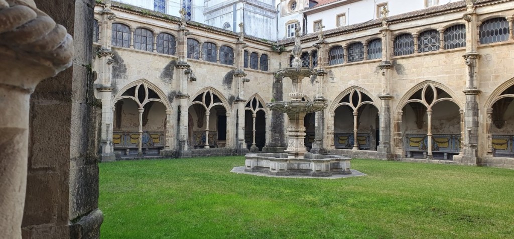 We lopen wat rond en dalen de trappen weer af naar het klooster Santa Cruz. Dit blijkt echt een juweeltje met een prachtige kerk waar 2 graven van Portugese vorsten liggen en een heel bijzonder koor boven op het balkon.