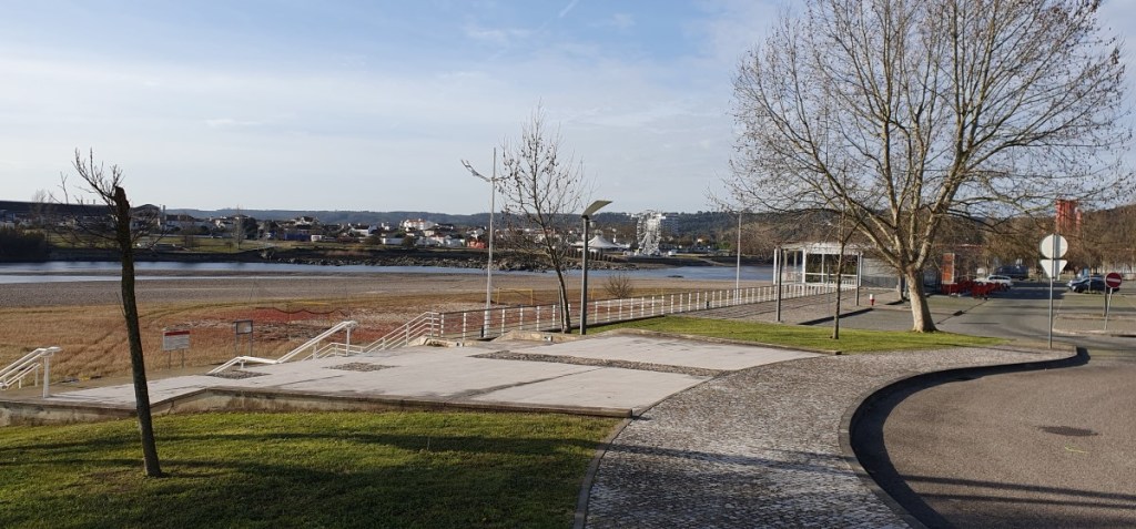 Over de N2 naar Abrantes. De officiële camperplek is bezet in verband met kermis dus we zoeken de andere kant van de Taag op en overnachten op een parkeerplaats. De volgende morgen ontbijten we met uitzicht over de Taag.