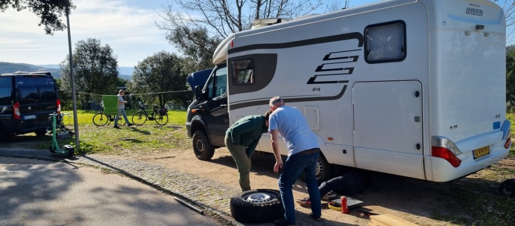 Dinsdag 14 februari, weer een lekke band! Zelfde als eerder en na het wisselen blijkt de velg nu op een andere plaats lek te zijn. Moet een nieuw wiel komen dus! Gaan we thuis doen. De mensen op de camping vinden het prachtig om te helpen. We hadden gevraagd om een compressor om de band op te pompen, maar voor we het weten liggen ze onder de auto. Super!