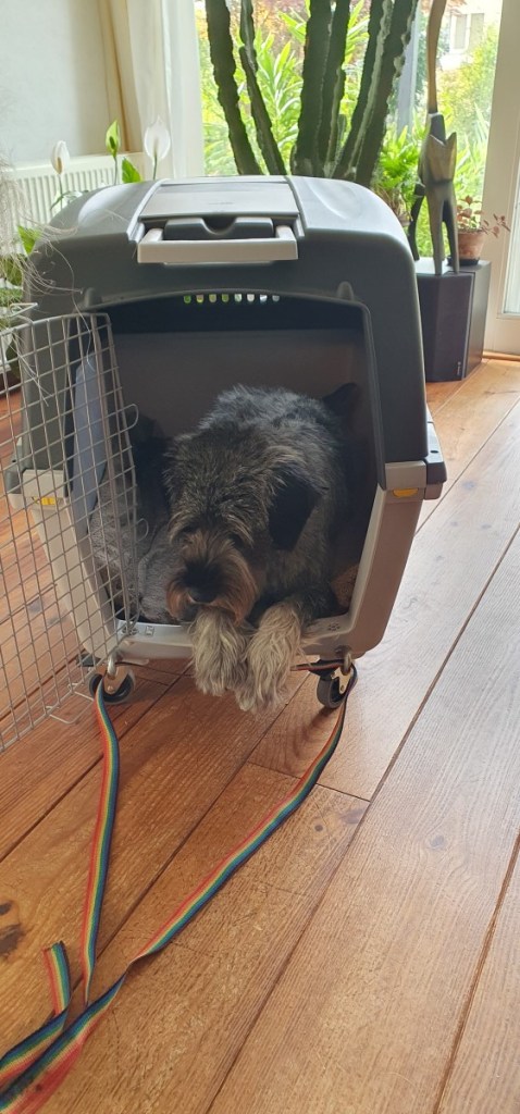 Hannes is een hoofdstuk apart. Natuurlijk gaat hij mee. Op reis zonder onze Hannes is voor ons ondenkbaar. De zoektocht naar alle voorwaarden, regels en regeltjes (deels in het Spaans!!!) waar hij aan moet voldoen en wat voor papieren nodig zijn is geen sinecure. Gelukkig is het NVWA in Utrecht weer super behulpzaam. Onverwacht probleem is het boeken van een vlucht waar Hannes op mee mag en kan. Hoewel de KLM rechtstreeks op Buenos Aires vliegt, vliegen ze met een type vliegtuig waar geen grote honden in mee kunnen!!! Complicerende factor is dat Hannes gezien wordt als ‘extra bagage’ die je pas kunt bijboeken als je zelf je vlucht al geboekt hebt…… Maar het is gelukt en we vliegen nu vanaf Frankfurt met de Lufthansa rechtstreeks naar Buenos Aires. Hannes heeft voor de reis een grote reiswieg gekregen. Inmiddels slaap hij daar al een paar maanden in en daarnaast zijn we regelmatig met hem aan het rondrijden/oefenen. Tot groot vermaak van zowel Hannes als ons…..