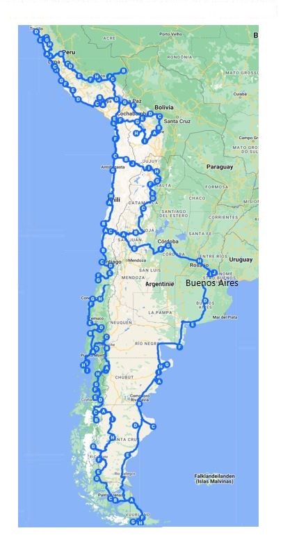 Naast al het ‘gedoe’ zijn er natuurlijk ook heel veel leuke dingen voor te bereiden. Neem alleen al de voorpret met het inlezen in de reisliteratuur en het lezen van allerlei reisblogs en reisavonturen….. En natuurlijk ook het bedenken en plannen van onze reisroute. We hebben twee routes gepland. De eerste gaat van Buenos Aires naar het Zuiden, door Chili, Bolivia, Peru, Ecuador en Colombia naar Cartagena. Vandaar weer met de boot en het vliegtuig naar huis. Omdat het op dit moment erg onrustig is in Ecuador hebben we een tweede route gepland die Ecuador en Colombia vermijdt en ons weer terug brengt naar Buenos Aires. Halverwege de reis zullen we de knoop door moeten hakken welke route het gaat worden….