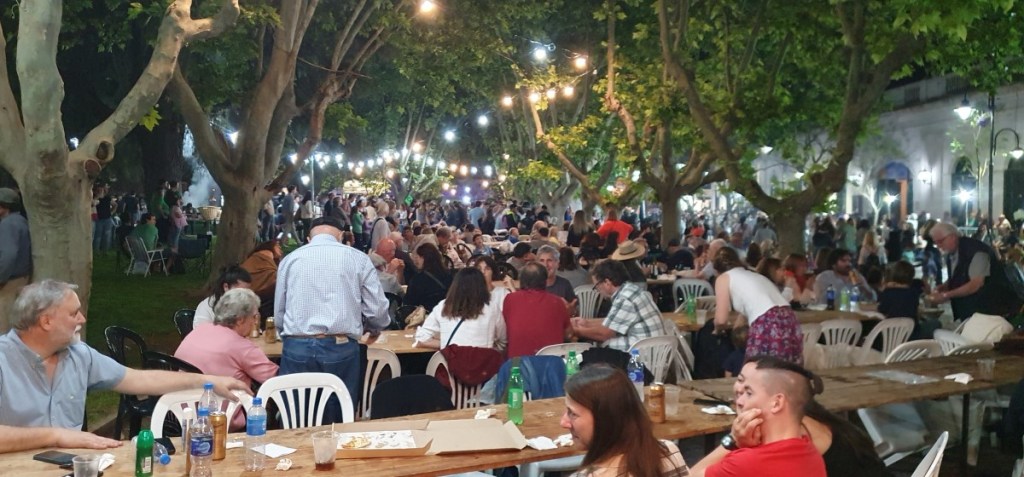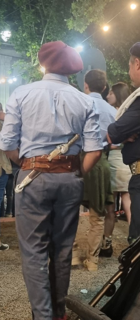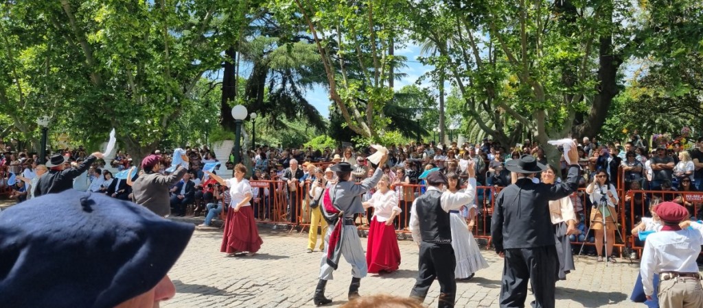 Op het centrale plein vinden we een plekje waar we alles goed kunnen zien. Eerst vurige toespraken over tradities en het leven der gaucho’s, kransleggingen door de plaatselijke bobo’s en dan begint het met een gezamenlijke dans. Opnieuw zijn de mensen prachtig aangekleed.