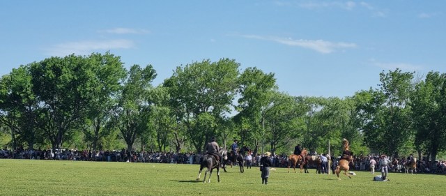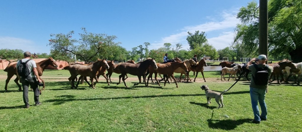 Dan komen de eerste paarden. Per groep, vaak een Estancia (boerderij), komen de paarden met de mooi uitgedoste gaucho’s en de vrouwen voorbij. Geweldig om te zien! Tussendoor ook groepen ongezadelde paarden met een gaucho, die voor het podium even een rondje draaien…. We kijken onze ogen uit, maar aan de andere kant komt er ook geen einde aan.
