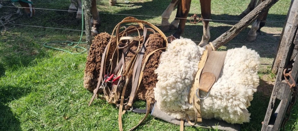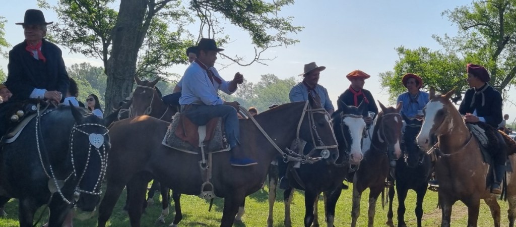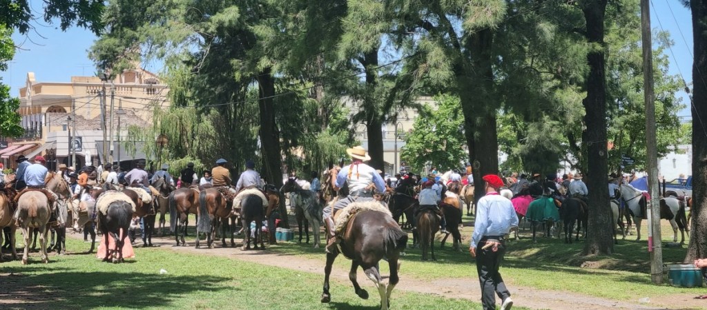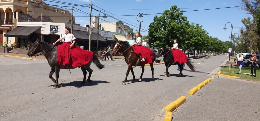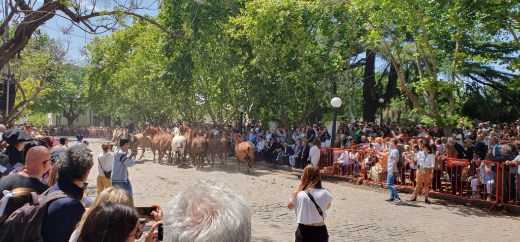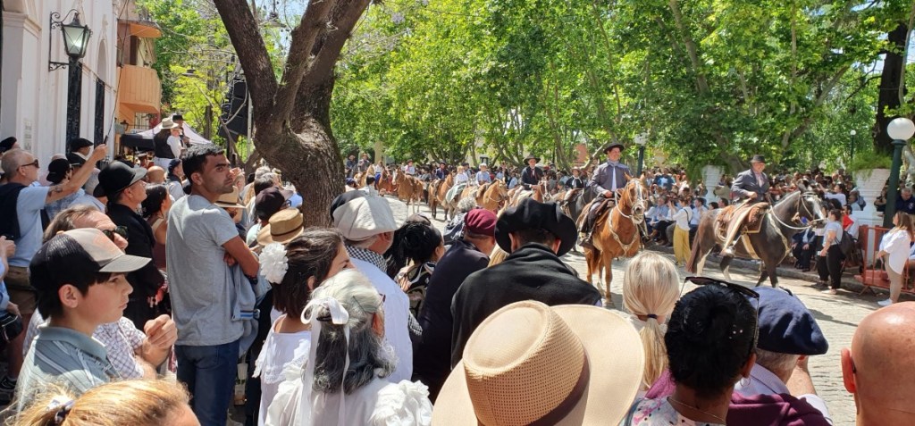 Zondag 12 november zijn we weer vroeg op. Om 10 uur zou de uitgestelde paardenshow plaatsvinden. Helaas…. het veld is nog veel te nat. Dus in plaats daarvan gaan we naar de officiële parade op het centrale plein in San Antonio de Areco. Voordat we daar zijn vallen we midden in de voorbereidingen van de parade. Echt duizenden paarden staan klaar. Met en zonder berijders…. Vrouwen met prachtige jurken, gedrapeerd over de kont van het paard, kinderen die nauwelijks in het zadel kunnen blijven zitten, gaucho’s met hun lange messen achter in de riem, groepen ongezadelde paarden op kleur gesorteerd….. Kortom we komen ogen te kort. En het mooie is dat alles gewoon los en door elkaar loopt.