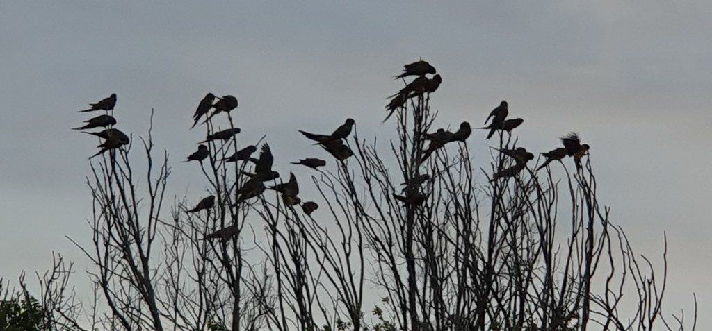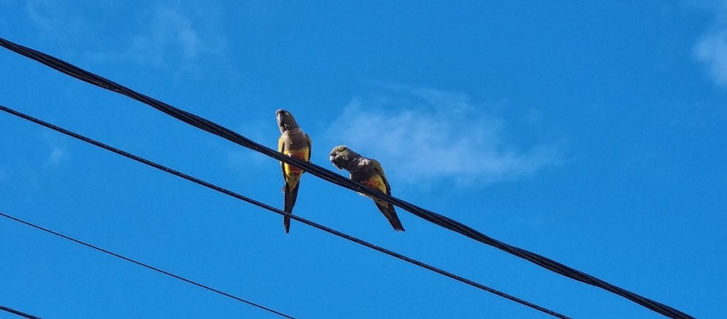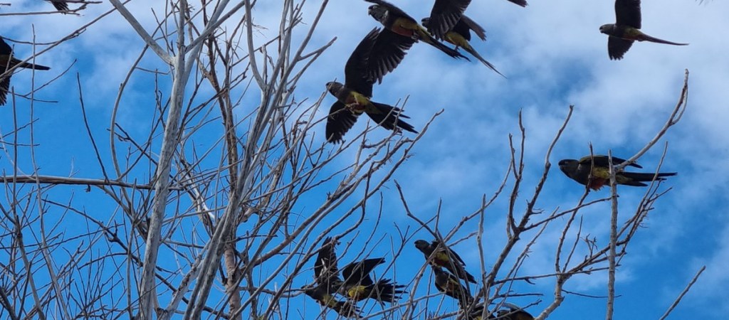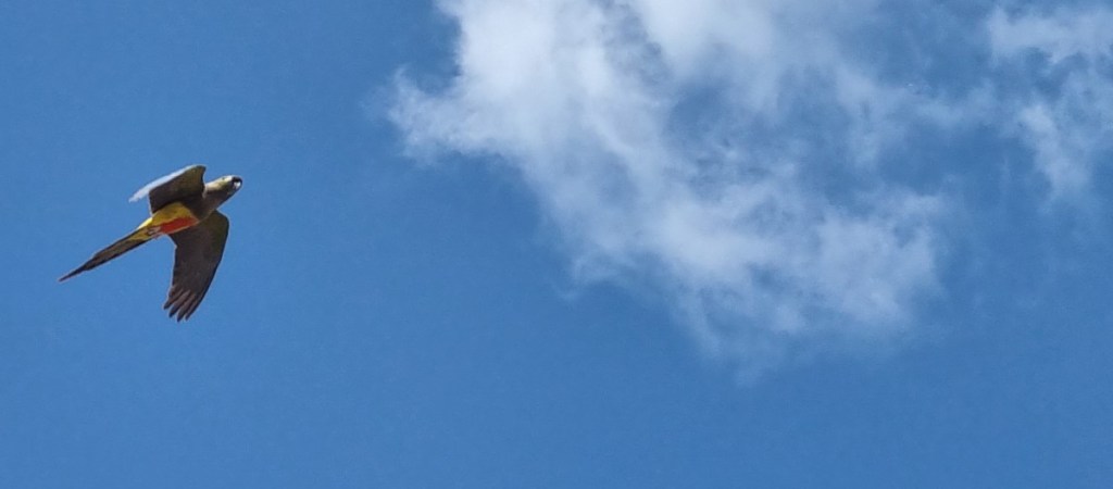Mooi he, die papegaaien. Ik wilde opzoeken hoe ze heten, maar iemand heeft mijn vogelgids meegenomen …..Gelukkig is er internet: burrowing parrot ofwel holenparkiet.