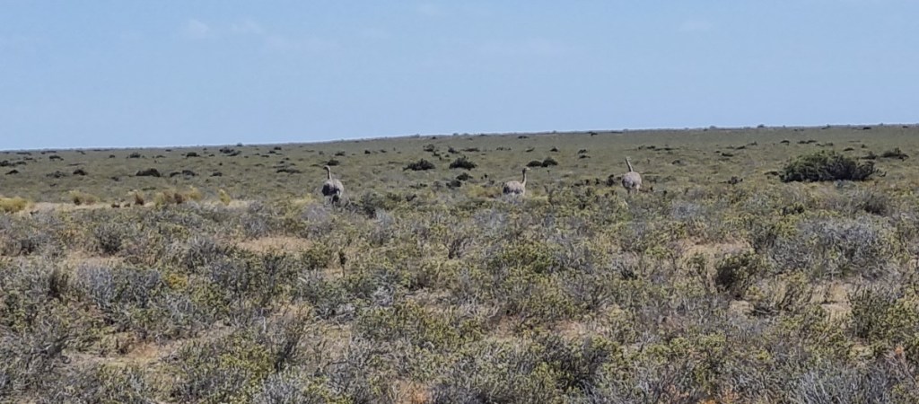 We rijden verder op de R3 en nemen de afslag naar Puerto Deseado. Hier wel weer veel wind en onderweg grote groepen guanacos.