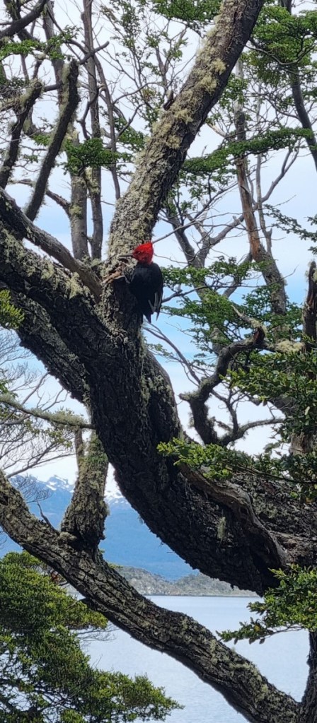 Het is ook het startpunt van de kustwandeling naar Alakush (het Informatiecentrum van het park). Een prachtige wandeling van ongeveer 8 kilometer langs de kust. Het gaat op en neer over de rotsen, dus best zwaar maar zeer de moeite waard! We zien onderweg veel vogels, waaronder de fraai gekleurde Magelhaenspecht met een vuurrode kop.