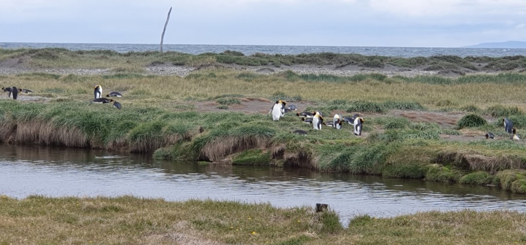 Chileense kant gaat gelukkig sneller. Helaas moet ik bij de groente en fruit controle mijn ingevroren biefstuk tartaar inleveren! Mag dus ook niet. Vorige keer hadden ze hier niet naar gekeken. Naast groente en fruit is dus rauw vlees (ook ingevroren) een no go! Dan is het nog 65 km, waarvan de laatste 15 ripio) naar Reserva Natura Pinguïno Rey. We parkeren de auto op de parkeerplaats met uitzicht op de pinguïns in de verte.