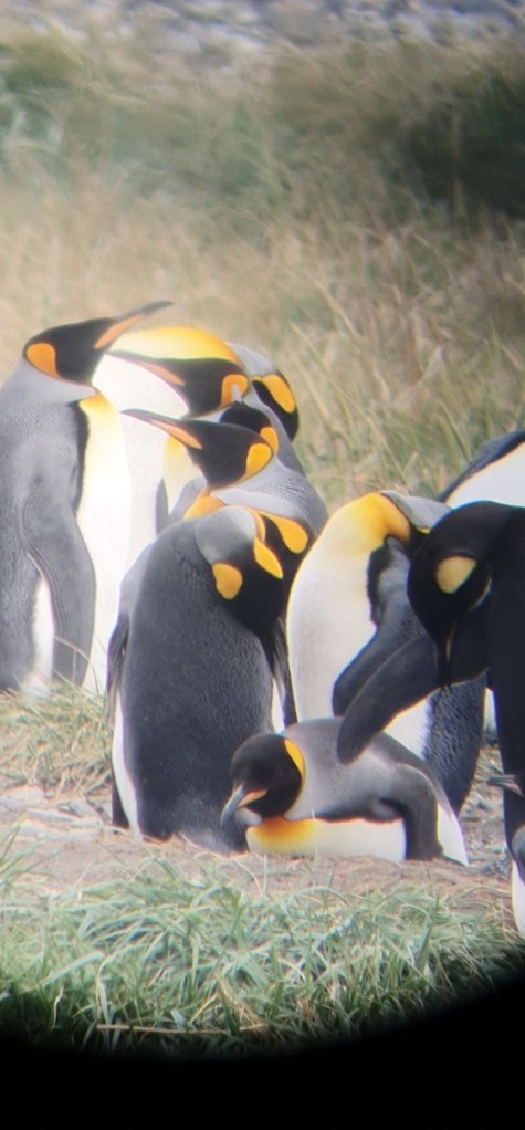 Om 1 uur mogen we naar binnen en krijgen we een rondleiding naar de King pinguïns. Per keer mag er een groepje van 15 mensen kijken. Er zijn ca. 4 kolonies in de wereld met King pinguïns. Hier leven er ongeveer 160. Prachtige beesten (bijna een meter hoog). We mogen een uurtje genieten. De gids leert ons een trucje om door de verrekijker te fotograferen. Levert verrassende foto’s op.