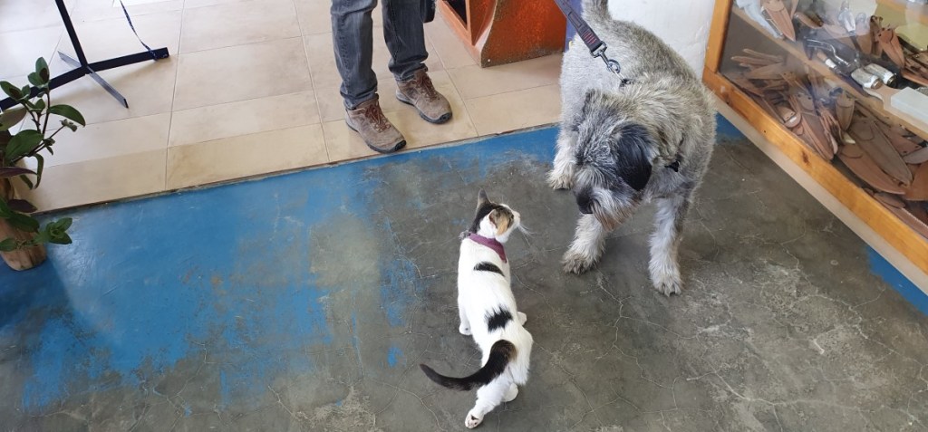Dinsdag 26 december. Tweede kerstdag wordt niet gevierd in Zuid Amerika, dus we gaan weer op pad. We gaan Chili in. Eerst langs de dierenarts om de papieren van Hannes voor de grensovergang te laten controleren. Onduidelijk is of Hannes nog een gezondheidsverklaring moet hebben of dat de huidige Argentijnse Senasa papieren (geldig tot 10 januari) voldoende zijn. De meeste dierenartsen die wij tot nu toe gezien hebben combineren hun praktijk met een dierenwinkel. Deze dierenarts combineert haar praktijk daarnaast ook nog met planten, een servicepunt voor een wasserette en nog veel meer spullen. Er loopt een poesje rond wat helemaal niet bang is voor Hannes, die weet het niet helemaal…..