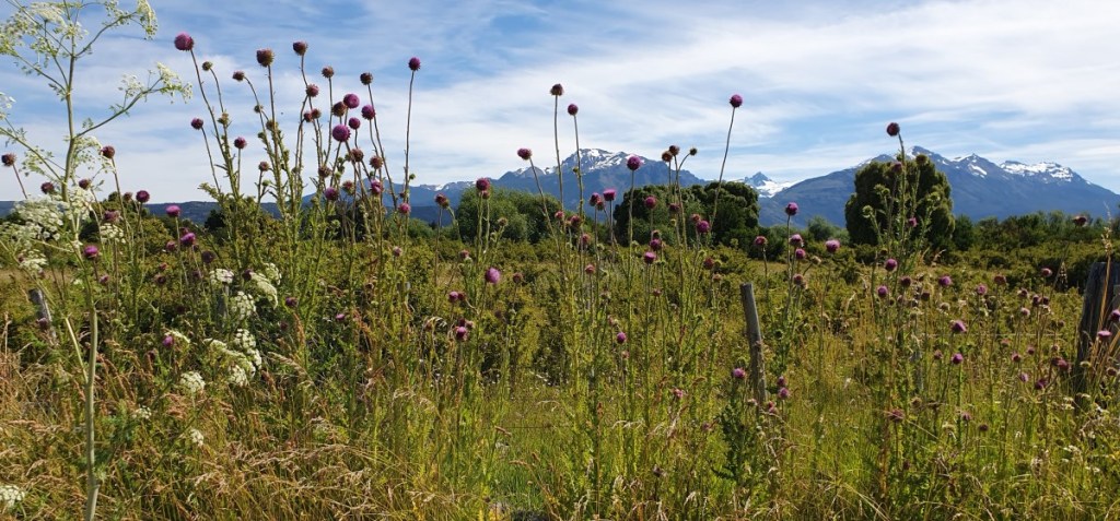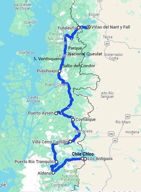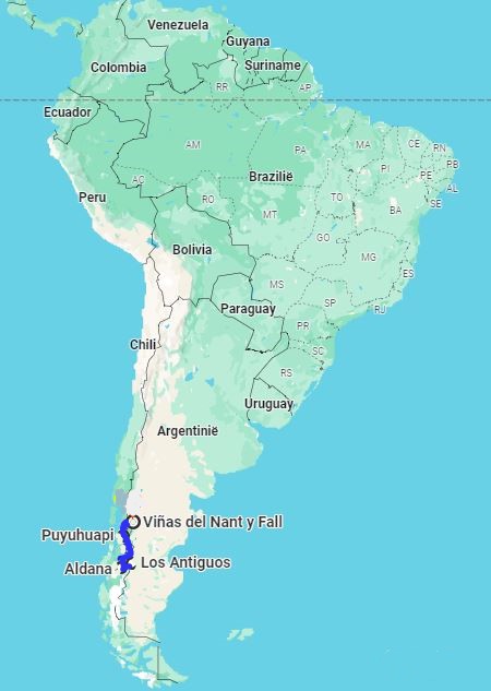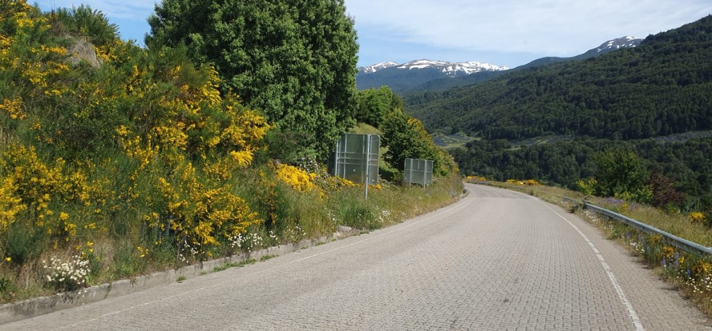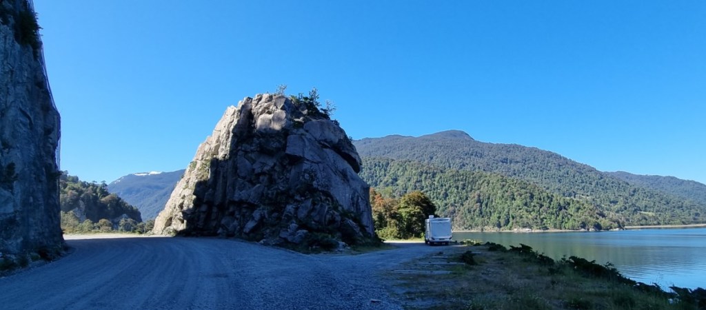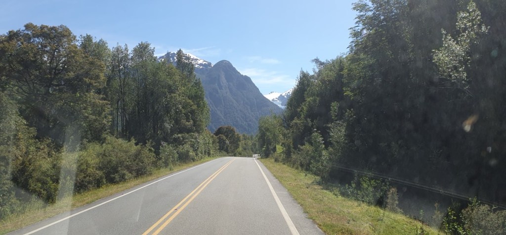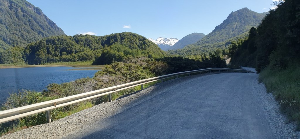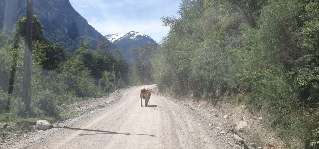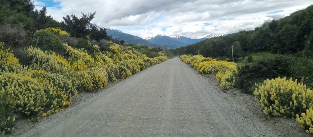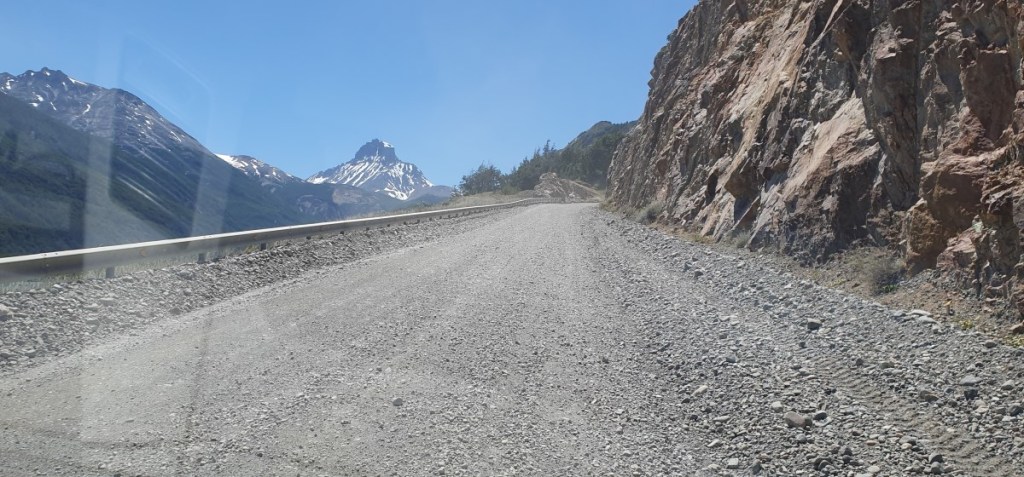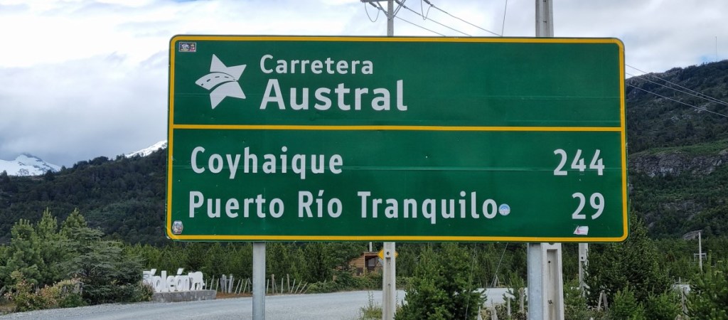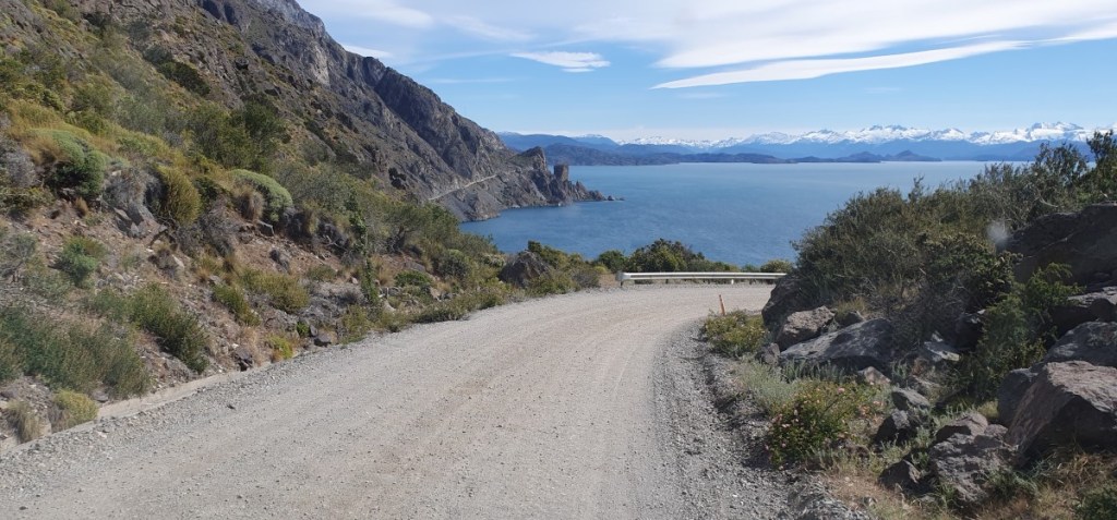 Bij Aldana komen we op Ruta 7, de Carretere Austral. Deze weg (men is met de weg begonnen in 1976 onder Generaal Augusto Pinochet) ontsluit de regio met een aaneengesloten Noord-Zuid route van Puerto Montt tot Villa O’Higgings, in totaal 1240 km. Een grotendeels onverharde weg die wel één van de mooiste ter wereld genoemd wordt. Het is dan ook een toeristische trekpleister en zeker de helft van het verkeer wat je tegenkomt is toerist. Van kleine volkswagenbusjes tot grote expeditie trucks, liftende backpackers en opvallend veel fietsers! Geen eenvoudige opgave over al die hellingen met los grind en dikke stofwolken van het passerende verkeer!