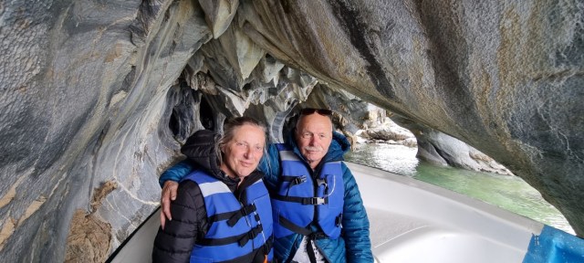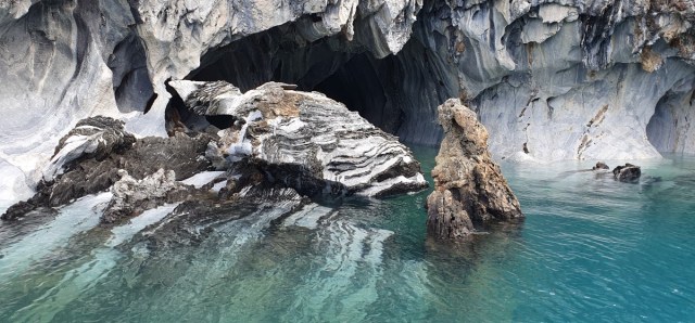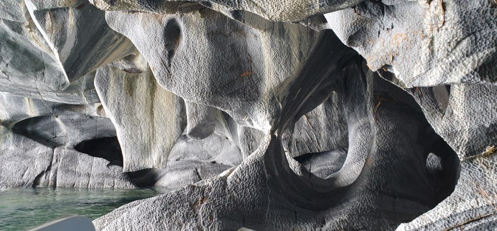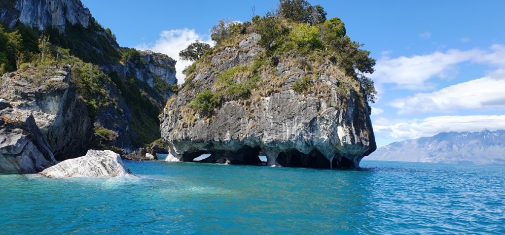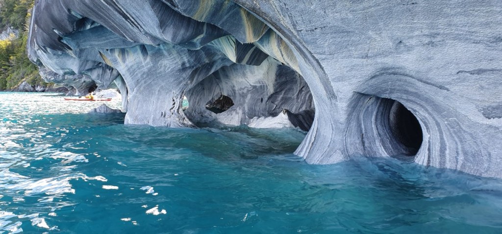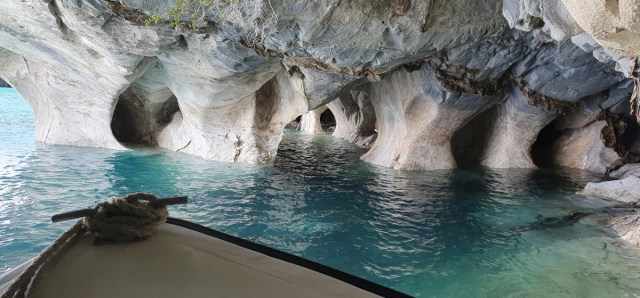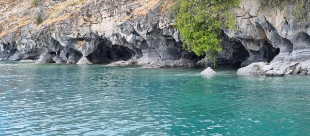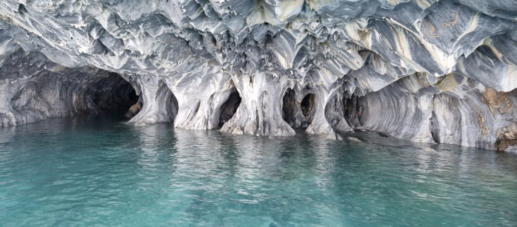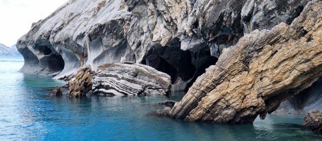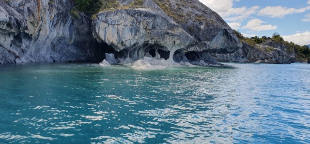 Dan komen de eerste marmergrotten in zicht. De grotten zijn uitgesleten door het water en het water heeft een prachtige structuur op het ‘marmer’ achtergelaten. De gids vertelt over stalactieten en stalagmieten in marmer??? Wij kennen dit in Europa eigenlijk alleen in kalksteen…. De gids komt er met zijn uitleg niet helemaal uit, of ik snap het niet, kan natuurlijk ook. In ieder geval is het heel bijzonder. Vooral als het zonnetje erbij komt en het water prachtig blauw kleurt.