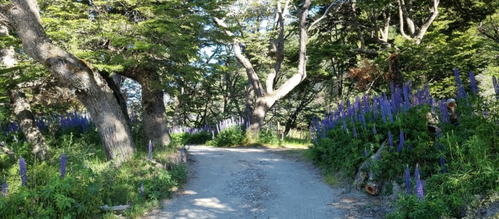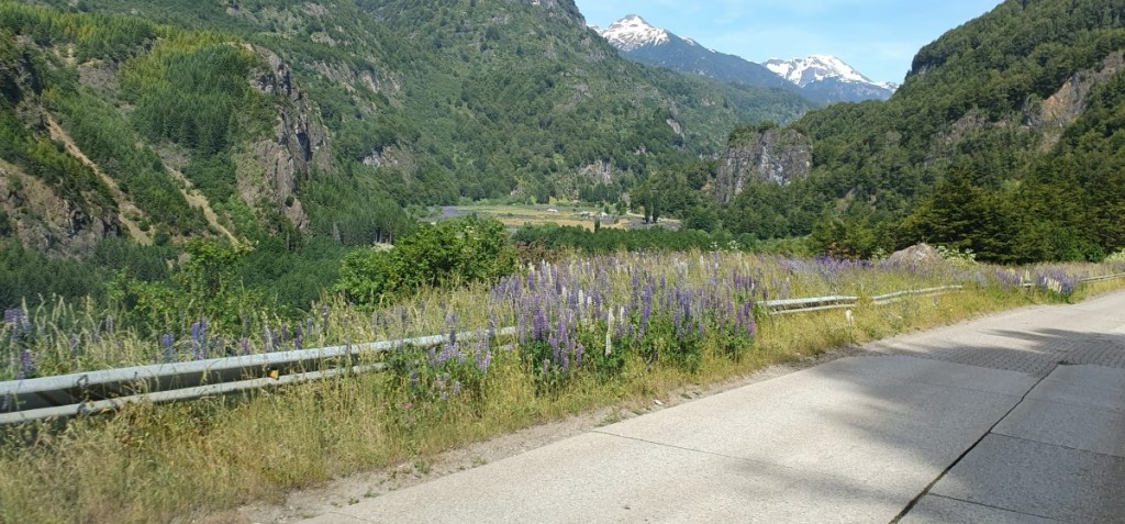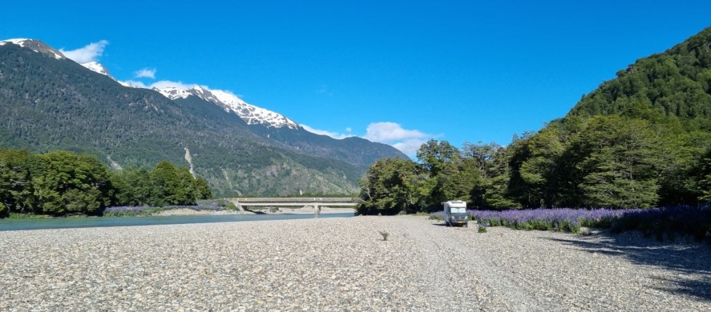 Donderdag, 28 december. Een stralend blauwe hemel als we wakker worden. Wat een mooi plekje! We gebruiken wat rivierwater om de ramen van de auto schoon te maken. Het is droog en door de stofwolken van het rijden over ripio hebben we aardig matglas in de auto. Dan weer op pad. Het eerste deel is fantastisch. Langs de weg heel veel lupines. Gek genoeg hier weer gele.