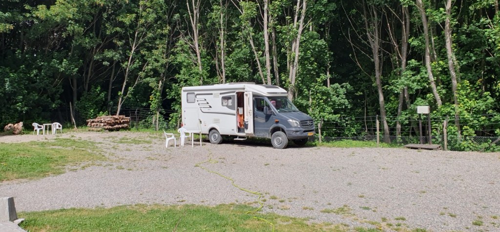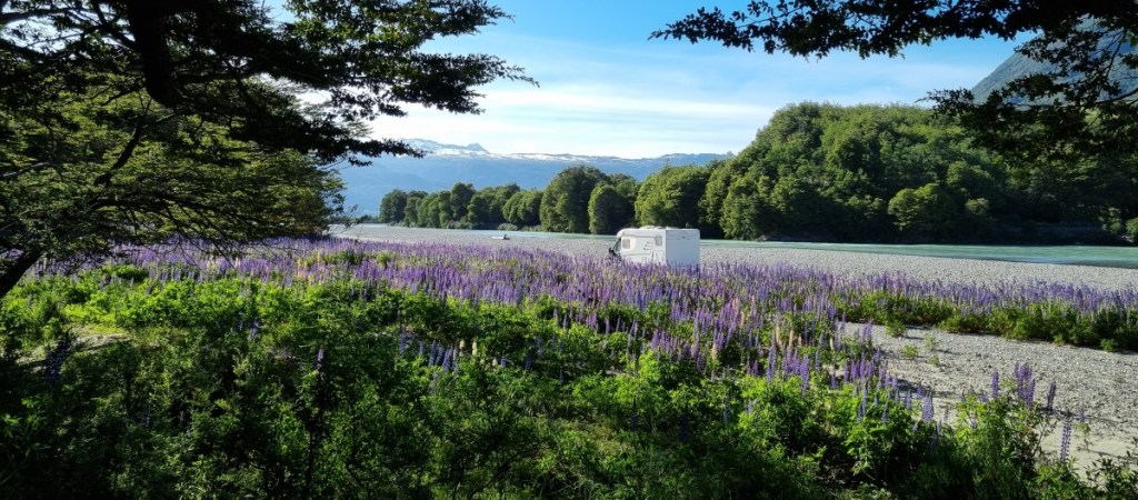 Terug leveren we de zwemvesten weer in en rijden nog een stukje verder naar een fantastisch plekje aan de rivier. Te midden van blauwe lupinen staan we aan de rivieroever. Weer zo’n fantastische overnachtingsplek!!!