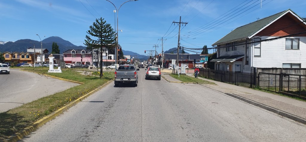 Tegen half vier rijden we Coyhaique in, de hoofdstad van de regio. Wat een drukte! We zijn zeker een kwartier bezig om een parkeerplaats te vinden in de buurt van de supermarkt. Ook daar is het hartstikke druk. Volgende stop is een winkel voor auto accessoires voor een nieuwe bandenspanningsmeter. Als we weer buiten komen is het is inmiddels zes uur en we hebben het gehad. Op naar de camping aan de rivier.