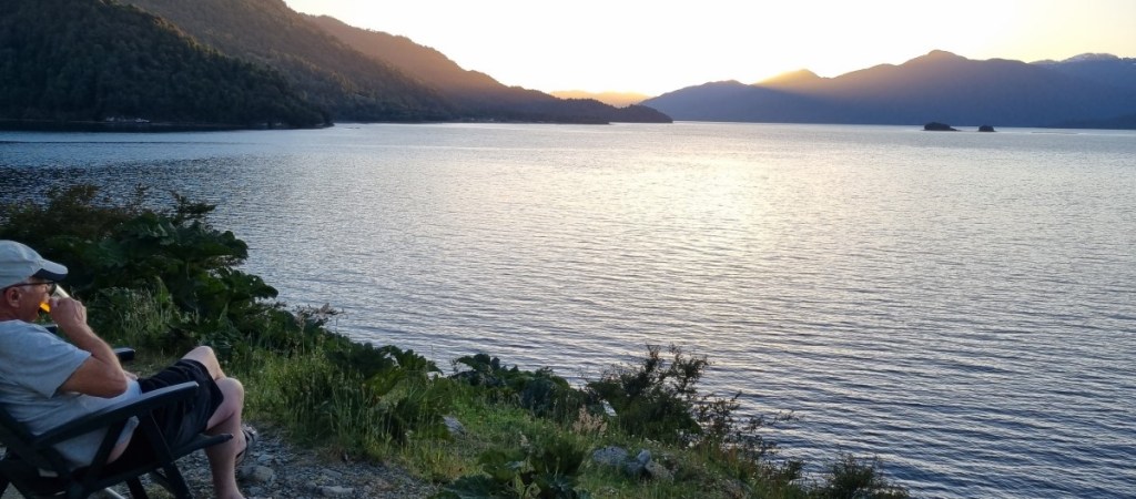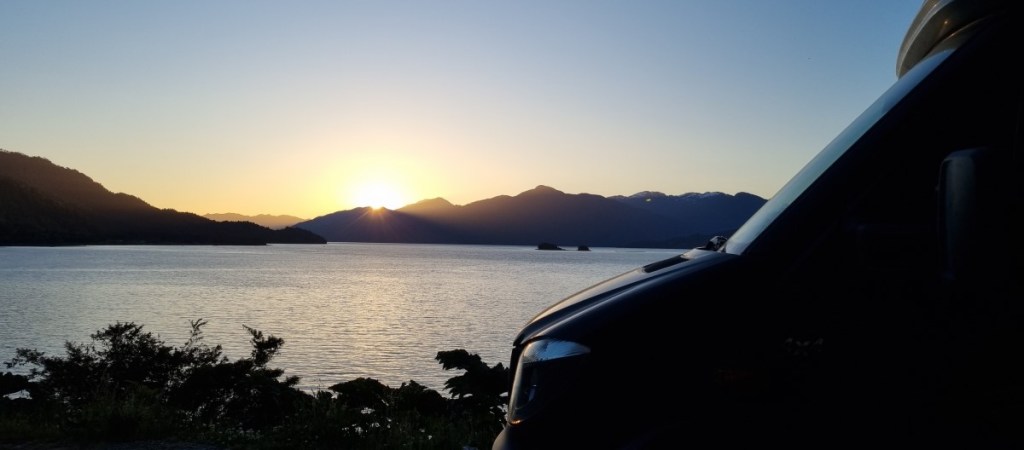 Als we weer verder tijden maakt het asfalt plaats voor ripio en we komen terecht in een lange steile afdaling met de ene na de andere haarspeldbocht. Het avontuur is weer terug! We rijden nog een klein stukje door en vinden een plekje aan het fjord S. Ventisquero. Het fjord heeft een open verbinding met zee en hier kunnen vaak dolfijnen gespot worden. En Yes, we zien ze in het kristalheldere water! We genieten van een prachtige zonsondergang voor de auto. Het is warm!