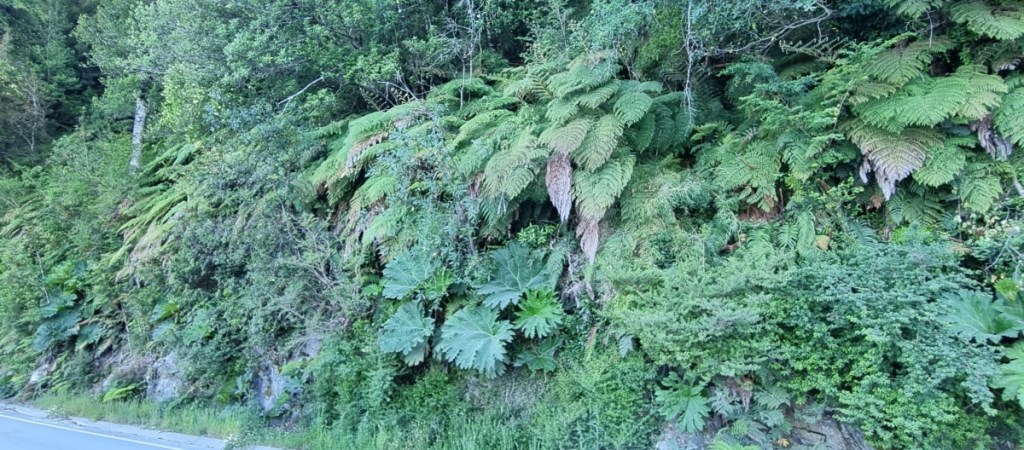 We rijden langs het fjord verder door een subtropische groene wereld van boomvarens, gunnera, bamboe en nog veel meer moois.
