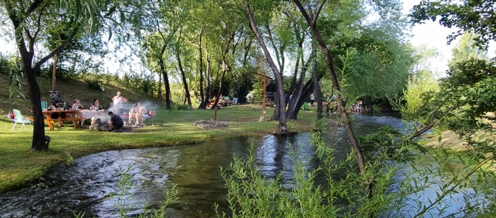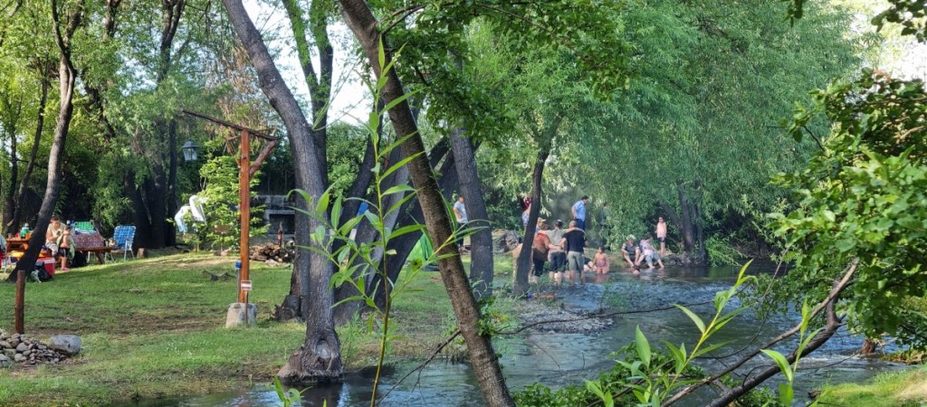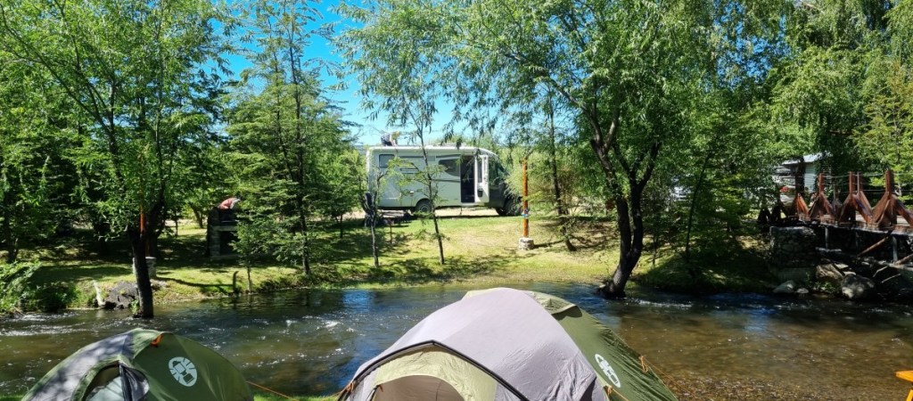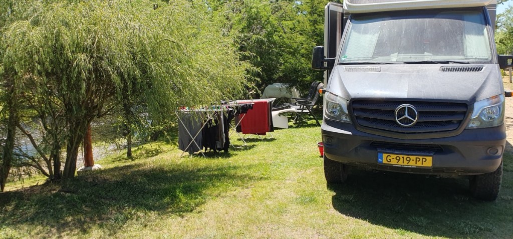 We overnachten bij het benzinestation. Zondag 31 december rijden we naar de grens. De Chileense kant is binnen 5 minuten gepiept, de Argentijnse kant iets langer, 10 minuten. Maar dat komt omdat de douane ambtenaar Hannes wilde zien! Hij had een mini schnauzer…. Het is nog 30 km naar de camping Vinas Nant y Fall (bedankt T&I voor de tip!) De camping ligt in een wijngaard aan een riviertje. Argentijnen komen hier graag een dagje met de hele familie om lekker te BBQ’en. Hier willen we oud en nieuw vieren. De camperplekken zijn vol en we krijgen een mooi plekje aan het riviertje.