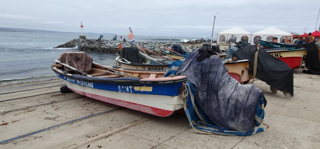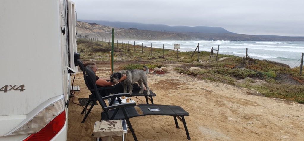 We rijden via de Ruta 5 een stuk (tolweg) door het binnenland en dan langs de kust. Onderweg verkopers van de lokale zoetigheid die met waaiers proberen de aandacht van de voorbij flitsende auto’s te trekken. Er wordt gewoon gestopt op de snelweg, wat soms ‘wonderlijke’ situaties tot gevolg heeft….. Vlak na Los Vilos vinden we een camping pal aan zee. Geweldig wat een uitzicht op de golven!