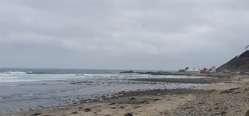 Hier blijven we een dagje extra. Lekker aan het strand. Het is bewolkt, maar de temperatuur is prima. Op een soort pier naast ons is van alles te doen met kraampjes die eten verkopen (meest vis en schaaldieren) en live muziek. Gezellig! We kopen een zak met krabpoten en spiesjes abalone. Bij de camper wordt het gereedschap er bij gehaald….
