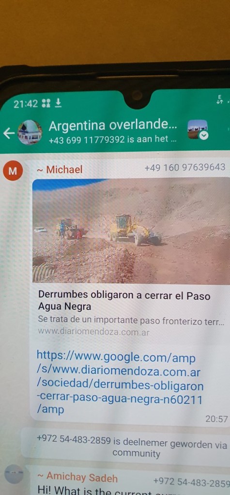 Terug bij Hannes eerst even wat gegeten en weer verder op pad naar Vicuna, richting de Paso Agua Negra, de grensovergang naar Argentinië. Gisteren hadden we gehoord dat de pas dicht was als gevolg van slecht weer en landverschuivingen, maar vandaag is de pas weer open, dus we kunnen! We zijn lid van diverse WhatsApp groepen over Zuid Amerika. Groot voordeel is dat je informatie kunt uitwisselen en vragen kunt stellen. Ideaal!!!