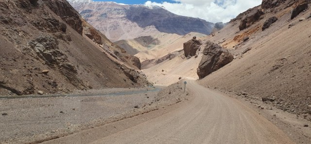 Gestadig aan klimmen we naar 2200m en eigenlijk is er geen kip op de weg tot het bij de douane ineens druk wordt. Komt vooral omdat de controle zo langzaam gaat en voor alle documenten van stempels voorzien zijn…… 12:45 mogen we eindelijk verder. Krijgen een bonnetje mee en we moeten aangeven of we wel of niet op de pas overnachten. Als we niet aankomen aan de andere kant gaan ze ons zoeken….. Het eerste stuk is nog zo’n 30 km mooi asfalt maar bij het stuwmeer is het in eens op, ripio. We hobbelen heftig, even vergeten dat door de hoogte een bar extra in de banden zit. We laten wat lucht uit de banden en hobbelen (iets minder) door.