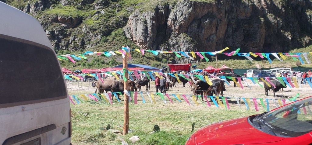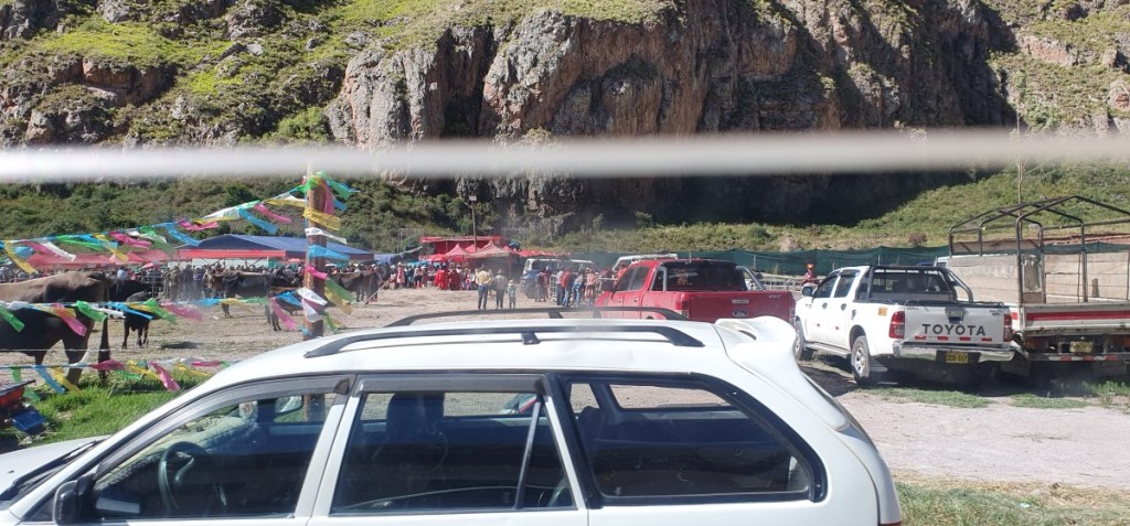 Ondertussen zijn wij in het centrum van Cuzco opgepikt door een taxi die er goed vaart in zet. Onderweg rijden we langs een lokale Feria (jaarfeest).