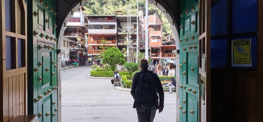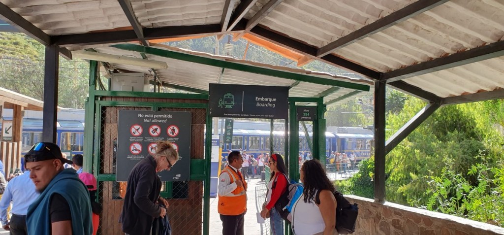 We zijn een half uur vroeger dan gepland in Ollantaytambo bij het treinstation.Alles is super geregeld. In de trein gereserveerde zitplaatsen en op het station van Aqua Calientes worden we voor het eerst van ons leven opgewacht door iemand met een bordje met onze namen erop! De trein is speciaal voor de toeristen en er wordt zelfs een kleine show opgevoerd door onze treinstewards (Zuid Amerikaans liefdesdrama tussen een Inca dame en heer).