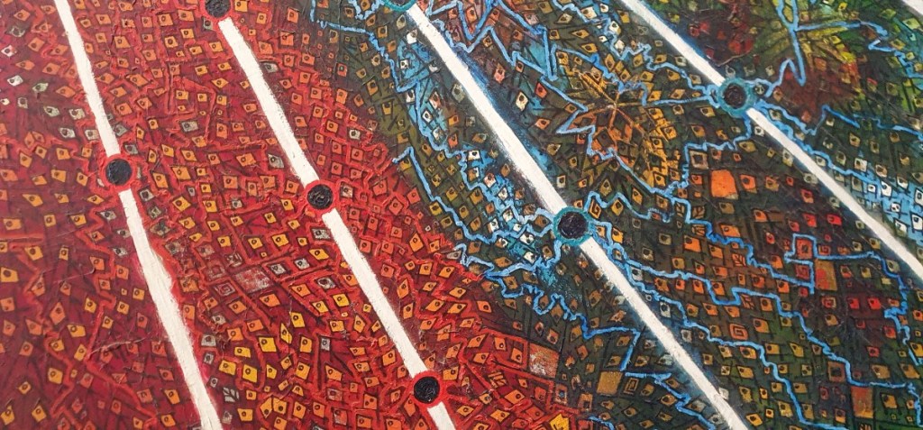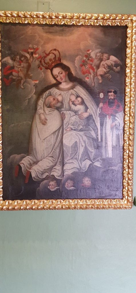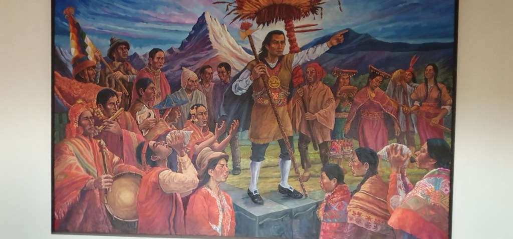 Ooit was El Templo del Coricancha (de Zonnetempel) het meest luisterrijke complex van Cuzco. De muren waren bekleed met gouden platen bezet met juwelen. Op gouden tronen zaten mummies van overleden Inca leiders getooid in prachtige gewaden en sieraden….. Dit alles is geroofd en verdwenen naar Spanje…. Resteren kale muren en toeristen die zich proberen voor te stellen hoe dit er ooit uitgezien moet hebben…. Heel bijzonder is de moderne kunst die hier hangt. Het werk van Miguel Araoz Cartagena verbeeldt de seqes en wakas vanuit Cuzco. Seqes zijn imaginaire lijnen die alle heilige plaatsen (wakas) met elkaar verbinden met als centrum Cuzco. De kleuren verbeelden de 4 regio’s van de Inca’s.