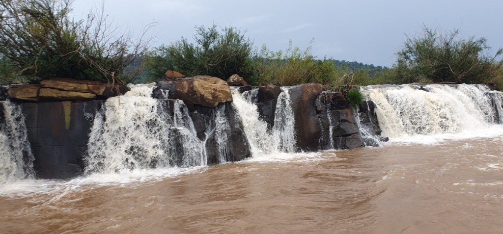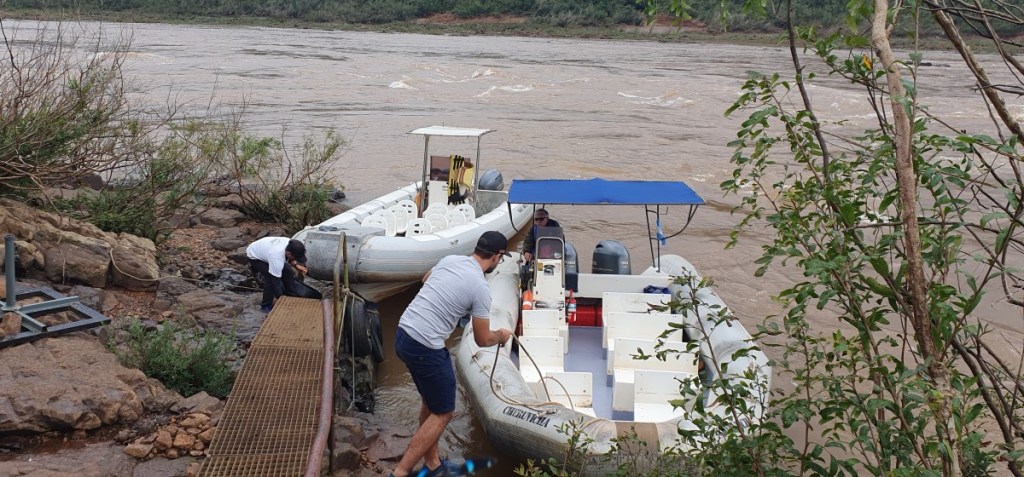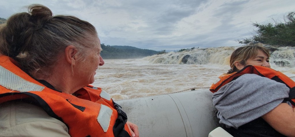 Daar vinden we een prachtig plekje aan de Rio Uruguay (de overkant is Brazilië). We willen de Saltos de Mocona bezoeken, maar we komen erachter dat deze zo’n 65 km noordelijker liggen. Omdat de watervallen steeds genoemd worden in samenhang met El Soberbio dachten wij dat ze er vlak bij zouden moeten liggen (uiteraard niet gechecked op Google Maps…..) Dus rijden we de volgende ochtend 65 km noordelijk, op de Ruta 2, die we eerder van plan waren te nemen vanuit Puerto Iguazu….. We zijn vroeg want de campingdame maant ons haast te maken. Om twee uur gaat het regenen! De weg kronkelt langs de rivier en het schiet niet echt op. Rond half twaalf zijn we in Parque Provincial Mocona. Net als we de boot op willen stappen begint het te regenen…. Te vroeg dus! Maar het blijft een prachtig tochtje.