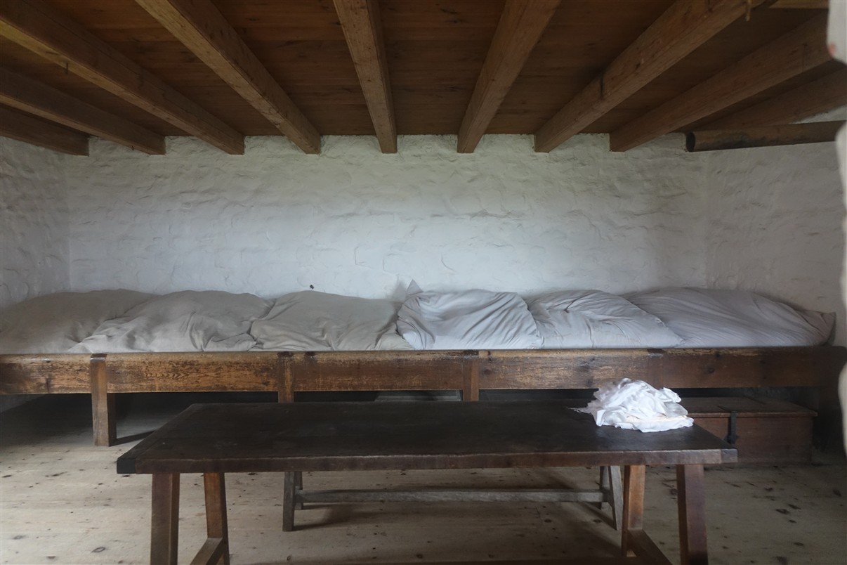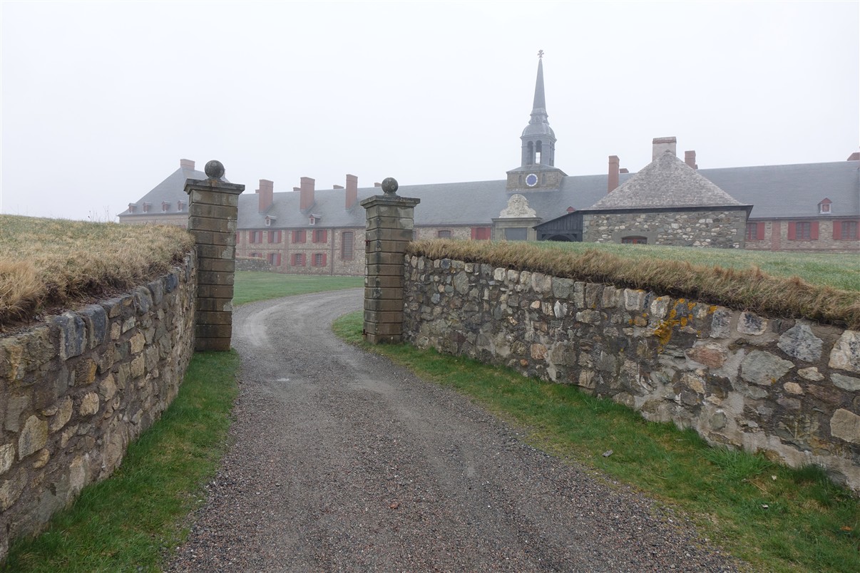De volgende ochtend bezoeken we Fortress de Louisbourg. Een deels gerestaureerd en deels gereconstrueerd fort. Eens de grootste Franse steunpost aan de Atlantische kust en nu een historisch openluchtmuseum. De vesting is een paar keer veroverd door de Britten en weer terugveroverd door de Fransen. In 1758 veroverden de Britten de vesting definitief en vernietigden het fort. Toentertijd woonden er duizenden mensen en de kade met een grote toegangspoort vormden het hart van de vesting. De Kings Bastion was het grootste gebouw en huisvestte 500 soldaten. We wandelen een uurtje rond in de mist en motregen. Vanaf half mei lopen hier mensen in kledij van toen en zijn de oude werkplaatsen in gebruik. Nu is het een spookstad.