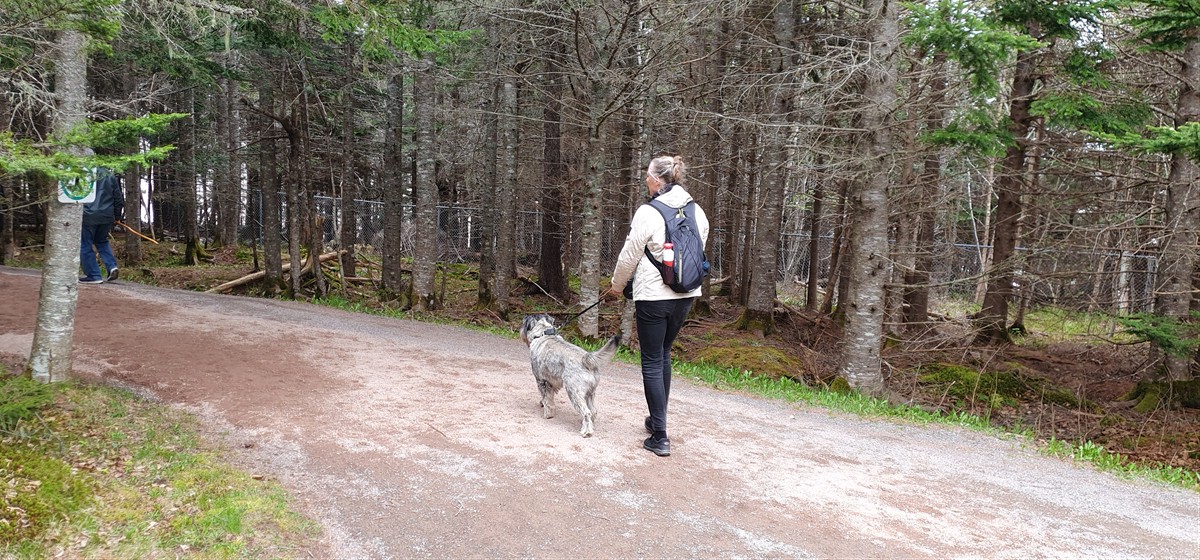 Zondag 18 mei. Het is mistig en regenachtig. We draaien een wasmachine & droger en daarna aan de wandel. Plan is een stukje van het Coast Path naar Herring Cove te wandelen. Na ongeveer twee kilometer geven we het op. De wandeling is gekwalificeerd als ‘difficult’ en dat klopt. Het pad is steil met veel losse rotsen en uitstekende boomwortels. Door de nattigheid bovendien ook nog eens spekglad.