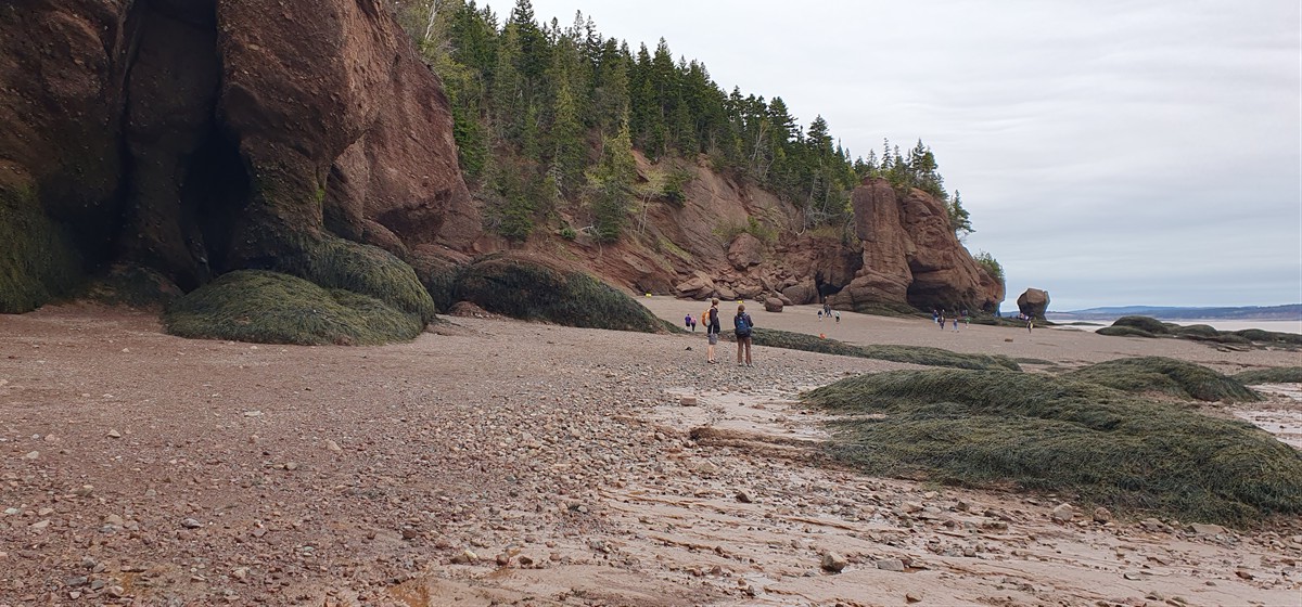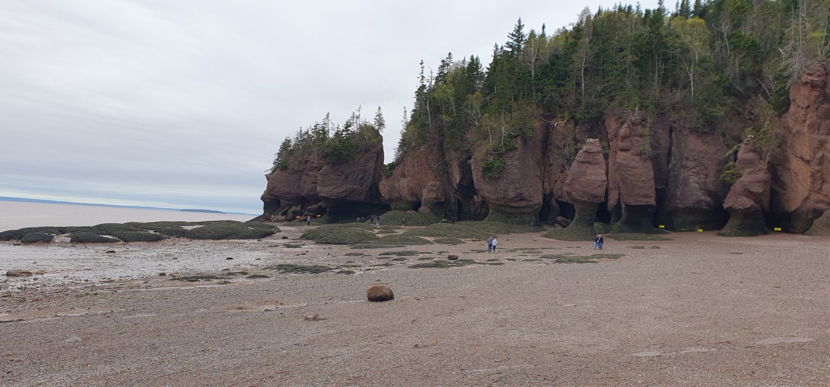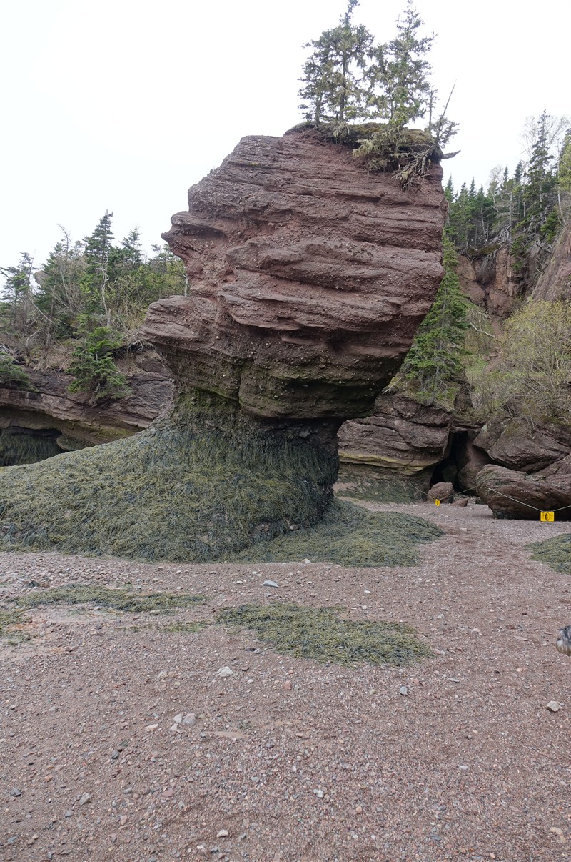 Volgende stop de Hopewell Rocks aan Chignecto Bay. Hier zijn extreme getijverschillen te zien (tot 15 meter), veroorzaakt doordat bij vloed het zeewater de trechtervormige Bay of Fundy ingeperst wordt. Twee maal per dag spoelt ruim 100 miljard ton water de baai in en uit. De enorme kracht van het water heeft bijzondere rotsformaties gevormd die ook wel de Flowerpot Rocks genoemd worden. De grillig gevormde rotsen hebben bovenop namelijk nog een forse toef begroeiing van bomen, varens en struiken. Bij eb kun je tussen de ‘bloempotten’ op de zeebodem lopen. Als wij aankomen is het vloed en zien we normale eilandjes omspoeld door zeewater.