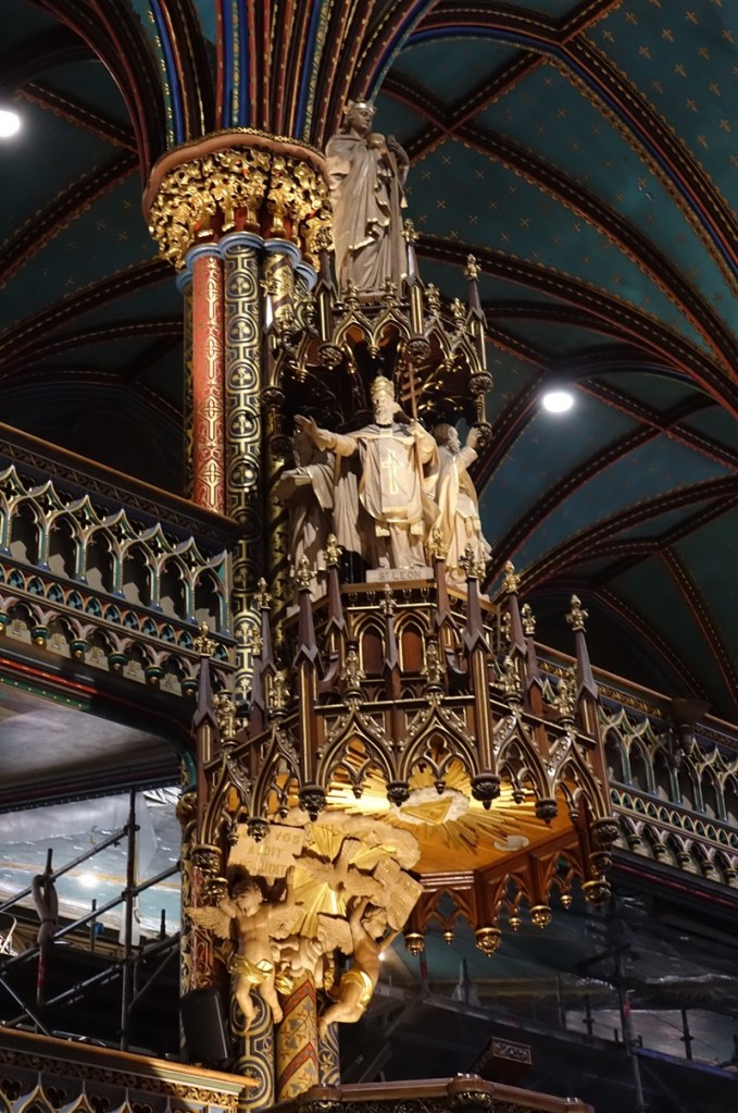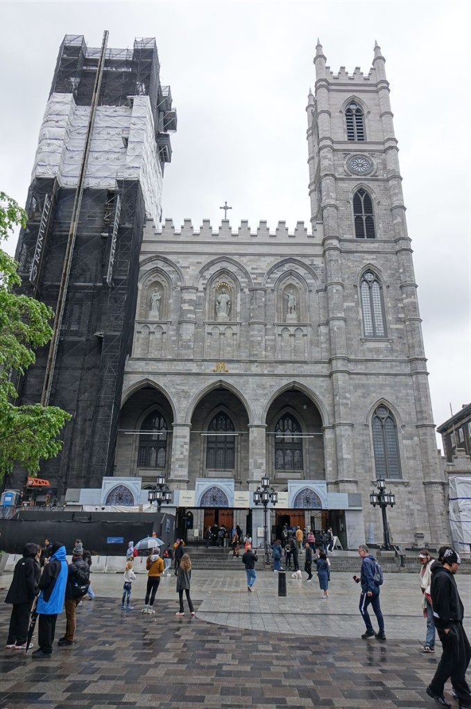 Bij mooi weer is het haventerrein vast een heel gezellig gebeuren, nu oogt het verlaten en troosteloos. We lopen naar de Basilique Notre Dame de Montreal uit 1829. Bij binnenkomst valt je mond open, wat een prachtige kerk. Het is net alsof je een gigantisch theater binnenkomt inclusief de oplopende vloer en balkons rondom…. Hedenavond treden voor u op….