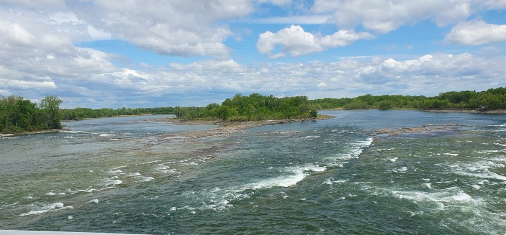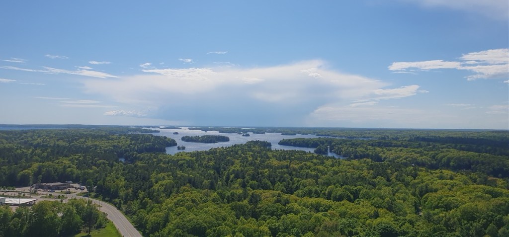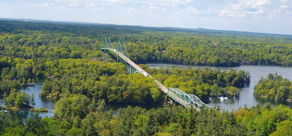 We rijden verder langs de oever van de St. Lawrence rivier over de 1000 Islands Parkway. Het is een prachtig gebied met vele kleine eilandjes, vaak bebouwd met huizen in alle soorten en maten. Soms is het huis groter dan het eiland…. Op ongeveer 600 m voor de grens met de VS staat de 1000 Island Tower (120 m hoog) met prachtig uitzicht over de St. Lawrence rivier. Natuurlijk gaan we boven kijken.