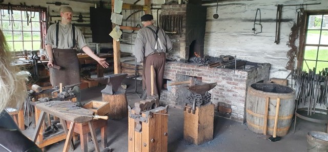 We rijden naar Upper Canada Village, een levend openlucht museum. In dit gebied is de St. Lawrence rivier verbreedt en verdiept om de (grote) scheepvaart naar de Grote Meren in de VS mogelijk te maken. Voor het behoud van het Canadese erfgoed zijn een 40 tal huizen/bedrijven uit 1866 uit dit ondergelopen gebied overgebracht naar het openlucht museum. We zien een spinnerij, korenmolen, zagerij, smidse, boerderijen, een kerk en nog veel meer. Ontzettend leuk omdat overal mensen in de kleding uit die tijd werken op de manier van toen en vertellen waar ze mee bezig zijn.