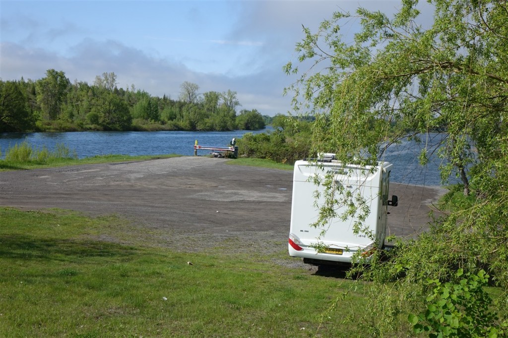 We overnachten bij de Seaway Locks (sluizen) in Iroquoise aan een meertje bij een vissteiger.
