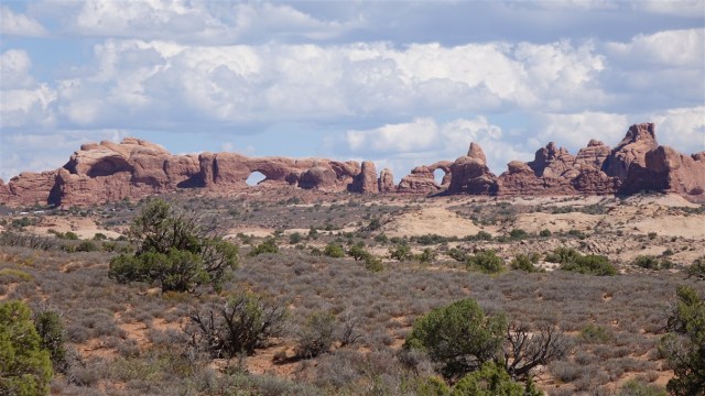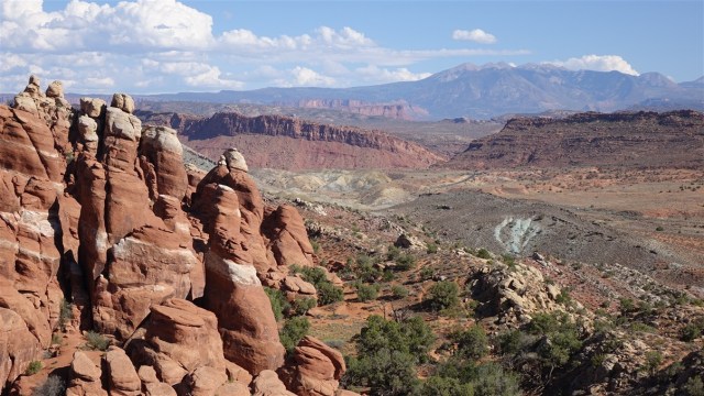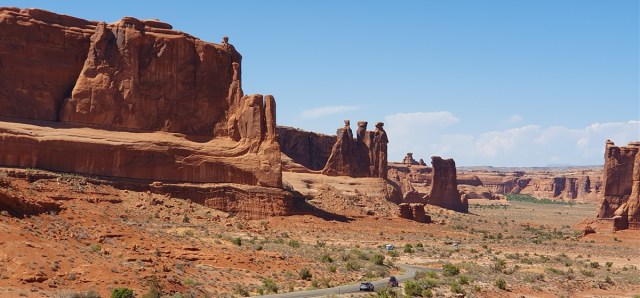 We lunchen met zicht op de Park Avenue rotsformatie. De namen zijn ooit bedacht door de eerste bezoekers van het park (en dus niet de oude inheemse namen!) Water, ijs, extreme temperaturen en het verdwijnen van ondergrondse zoutlagen zijn verantwoordelijk voor de haast gebeeldhouwde rotsformaties in Arches.