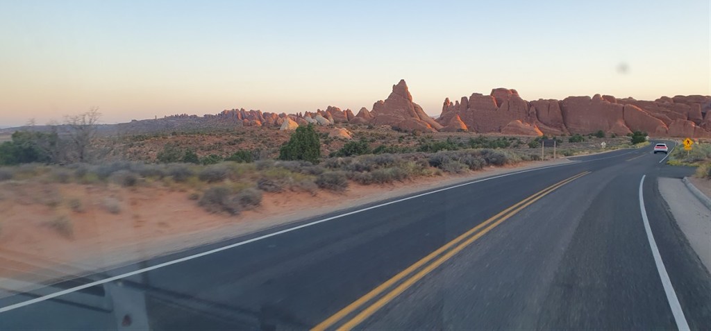 De volgende ochtend gaat de wekker om 5:45 uur!!! Voor 7 uur heb je geen tijdslot nodig om Arches binnen te komen. We vertrekken in een donkere wereld. Voor de toegangspoort naar Arches staat toch een korte rij (je moet natuurlijk wel entree betalen of je NP pas laten zien). Om 6:45 rijden we omhoog Arches in. Heel voorzichtig piept de zon over de rode rotsen. Een hele bijzondere wereld zo vroeg.