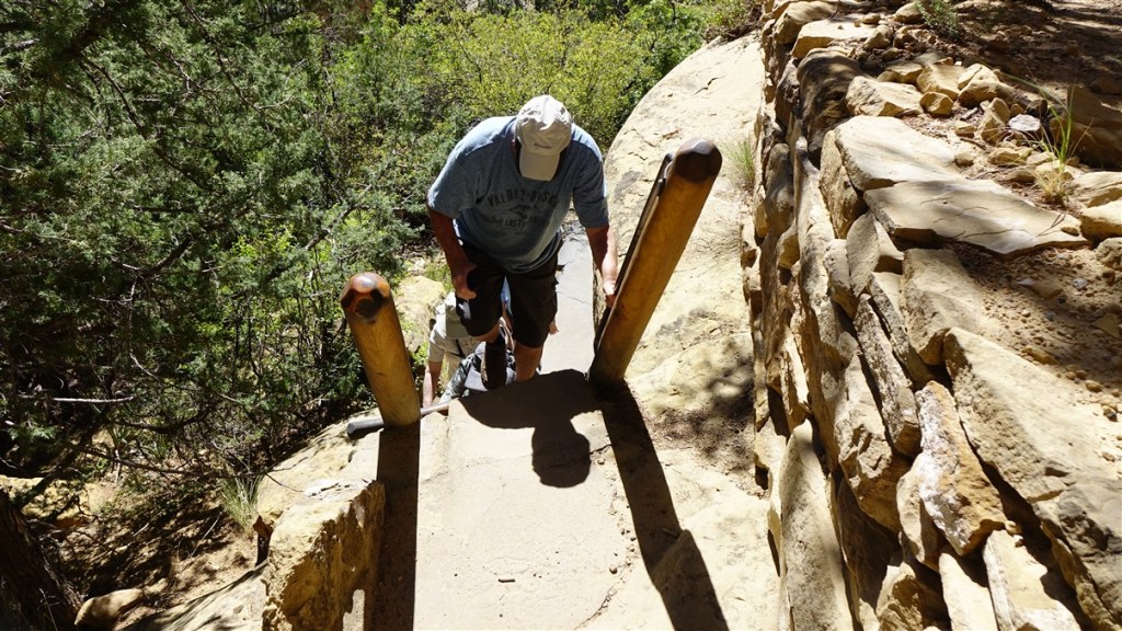 Het vakmanschap waarmee de kamers, kiva’s en torens met meerdere verdiepingen gebouwd zijn is indrukwekkend. Waarom de woningen verlaten zijn? De ranger noemt een aantal mogelijke oorzaken: droogte, overbevolking en/of conflicten. De werkelijke reden is onbekend, maar net als in Hovenweep trokken de Pueblo verder naar het zuiden en lieten deze bijzondere woningen verlaten achter…. 3 houten ladders weer omhoog staan we weer boven op de rim.