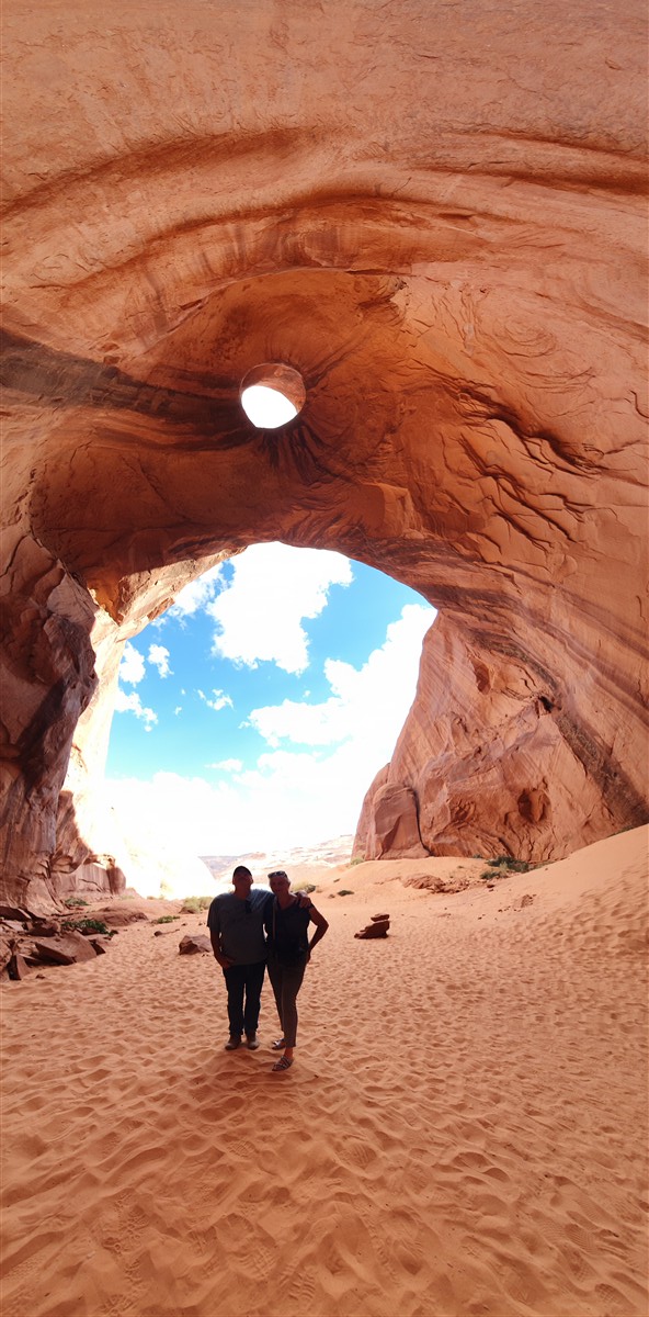 We rijden verder door een stuk van de vallei wat alleen met een toer toegankelijk is. Langs Arches en Windows. Jurad maakt een hele bijzondere foto van ons onder ‘the eye of the eagle’ en trakteert ons op prachtige Navajo muziek gefloten op een zelfgemaakte fluit van juniperus hout.