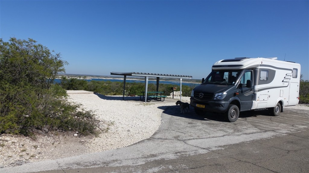 Onze visa worden opnieuw gecontroleerd door de Border Patrol en vlak voor we onze overnachtingsplek aan het Amistad Reservoir bereiken rijden we een file in. Autobrand, alle verkeer is stilgelegd. Wel grappig dat mensen gewoon hun campingstoeltjes uit de auto pakken en op de weg gaan zitten! De zon gaat bijna onder als we een prachtig plekje met zicht op het meer uitzoeken. We besluiten hier een dagje extra te blijven. Klusjes dag en tijd om de blog bij te werken.